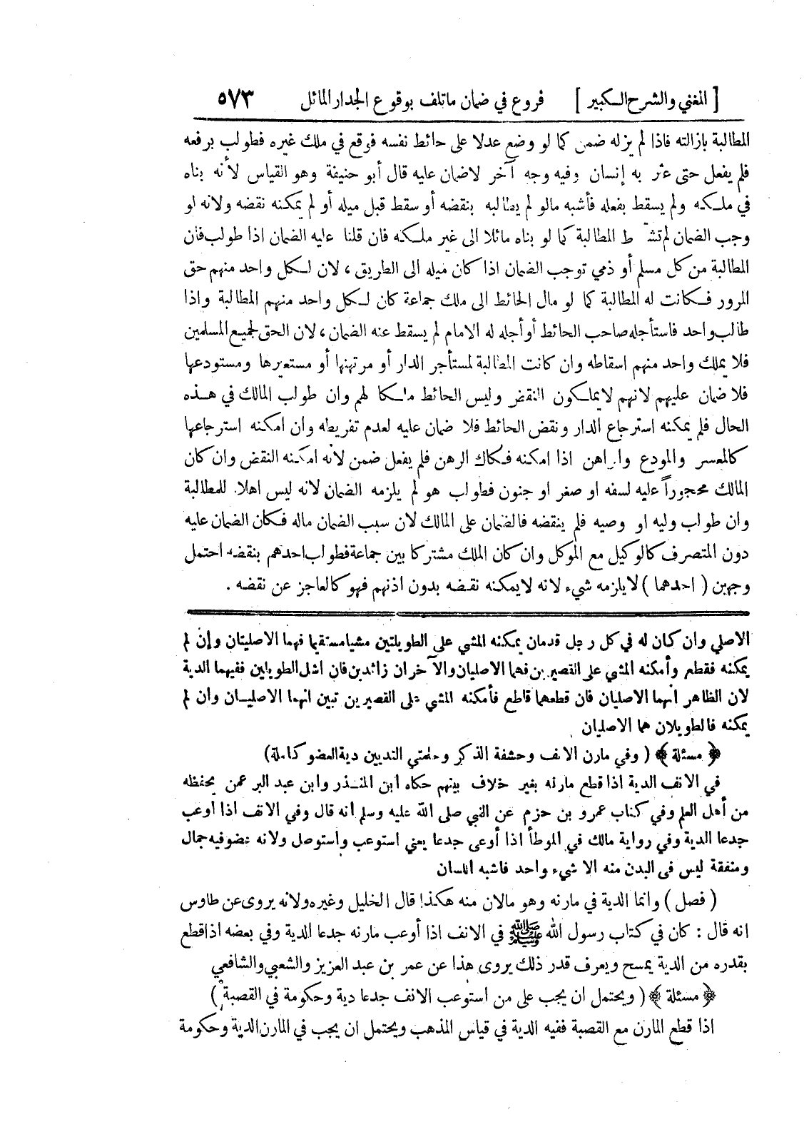 الأصلي وإن كان له في كل رجل قدمان يمكنه المشي على الطويلتين مشياً مستقيما فيهما الأصليتان وإن لم يمكنه فقطع وأمكنه المشي على القصيرين فيهما الاصليان والآخران زائدين فإن أشل الطويلين ففيهما الدية لأن الظاهر انهما الاصليان فإن قطعهما قاطع فأمكنه المشي على القصيرين تبين انهما الأصليان وإن لم يمكنه فالطويلان هما الأصليان (مسألة) (وفي مارن الأنف وحشفة الذكر وحلمتي الثديين دية العضو كاملة) في الأنف الدية إذا قطع مارنه بغير خلاف بينهم حكاه ابن المنذر وابن عبد البر عمن يحفظه من أهل العلم وفي كتاب عمرو بن حزم عن النبي صلى الله عليه وسلم انه قال وفي الأنف إذا أوعب جدعاً الدية وفي رواية مالك في الموطأ اذا اوعى جدعاً يعني استوعب واستوصل ولأنه عضو فيه جمال