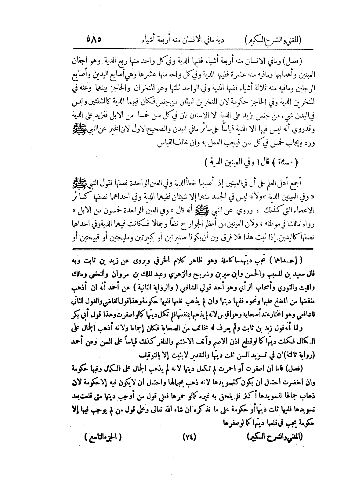 الكمال فكلمت ديتها كما لو قطع اذن الأصم وأنف الأخشم والظفر كذلك قياساً على السن وعن أحمد (رواية ثالثة) ان في تسويد السن ثلث ديتها والتقدير لا يثبت إلا بالتوقيف (فصل) فأما إن اصفرت او احمرت لم تكمل ديتها لأنه لم يذهب الجمال على الكمال وفيها حكومة وإن اخضرت احتمل أن يكون كتسويدها لأنه ذهب بجمالها واحتمل أن لا يكون فيه إلا حكومة لأن ذهاب جمالها لتسويدها أكثر فلم يلحق به غيرها كما لو حمرها فعلى قول من أوجب ديتها متى قلعت بعد تسويدها ففيها ثلث ديتها أو حكومة على ما نذكره إن شاء الله تعالى وعلى قول من لم يوجب فيها إلا حكومة يجب في قلعها ديتها كما لو صفرها