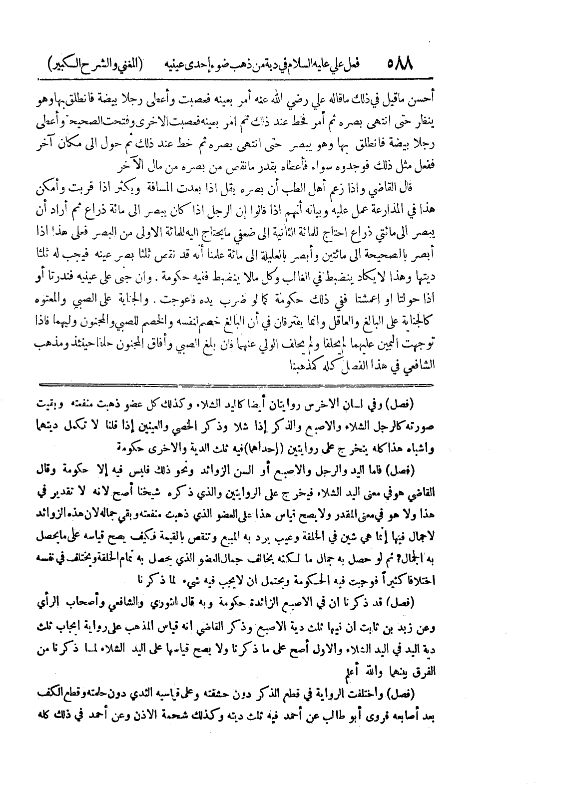 هذا ولا هو في معنى المقدر ولا يصح قياس هذا على العضو الذي ذهبت منفعته وبقي جماله لأن هذه الزوائد لا جمال فيها انما هي شين في الخلقة وعيب يرد به المبيع وتنقص بالقيمة فيكيف يصح قياسه على ما يحصل به الجمال؟ ثم لو حصل به جمال ما لكنه يخالف جمال العضو الذي يحصل به تمام الخلقة ويختلف في نفسه اختلافاً كثيراً فوجبت فيه الحكومة ويحتمل أن لا يجب فيه شئ لما ذكرنا (فصل) قد ذكرنا أن في الأصبع الزائدة حكومة وبه قال الثوري والشافعي وأصحاب الرأي وعن زيد بن ثابت ان فيها ثلث دية الأصبع وذكر القاضي أنه قياس المذهب على رواية ايجاب ثلث دية اليد في اليد الشلاء والأول اصح على ما ذكرنا ولا يصح قياسها على اليد الشلاء لما ذكرنا من الفرق بينهما والله أعلم (فصل) واختلفت الرواية في قطع الذكر دون حشفته وعلى قياسيه الثدي دون حلمته وقطع الكف بعد اصابعه فروى أبو طالب عن أحمد فيه ثلث ديته وكذلك شحمة الأذن وعن أحمد في ذلك كله