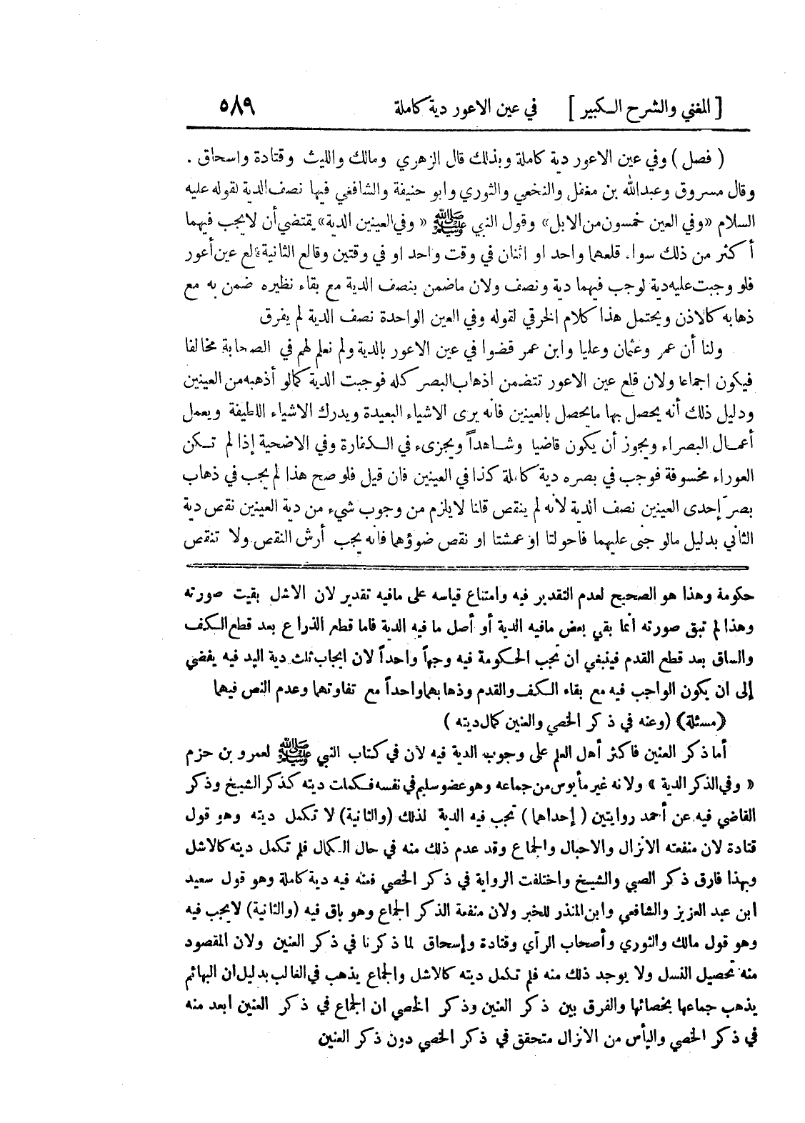 حكومة وهذا هو الصحيح لعدم التقدير فيه وامتناع قياسه على ما فيه تقدير لأن الأشل بقيت صورته وهذا لم تبق صورته انما بقي بعض ما فيه الدية أو أصل ما فيه الدية فأما قطع الذراع بعد قطع الكف والساق بعد قطع القدم فينبغي أن تجب الحكومة فيه وجهاً واحداً لأن ايجاب ثلث دية اليد فيه يفضي إلى أن يكون الواجب فيه مع بقاء الكف والقدم وذهابهما واحداً مع تفاوتهما وعدم النص فيهما (مسألة) (وعنه في ذكر الخصي والعنين كمال ديته) أما ذكر العنين فأكثر أهل العلم على وجوب الدية فيه لأن في كتاب النبي صلى الله عليه وسلم لعمرو بن حزم " وفي الذكر الدية " ولأنه غير مأيوس من جماعة وهو عضو سليم في نفسه فكملت ديته كذكر الشيخ وذكر القاضي فيه عن أحمد روايتين (إحداهما) تجب فيه الدية لذلك (والثانية) لا تكمل ديته وهو قول قتادة لأن منفعته الإنزال والإحبال والجماع وقد عدم ذلك منه في حال الكمال فلم تكمل ديته كالأشل وبهذا فارق ذكر الصبي والشيخ واختلفت الرواية في ذكر الخصي فعنه فيه دية كاملة وهو قول سعيد ابن عبد العزيز والشافعي وابن المنذر للخبر ولأن منفعة الذكر الجماع وهو باق فيه (والثانية) لا يجب فيه
