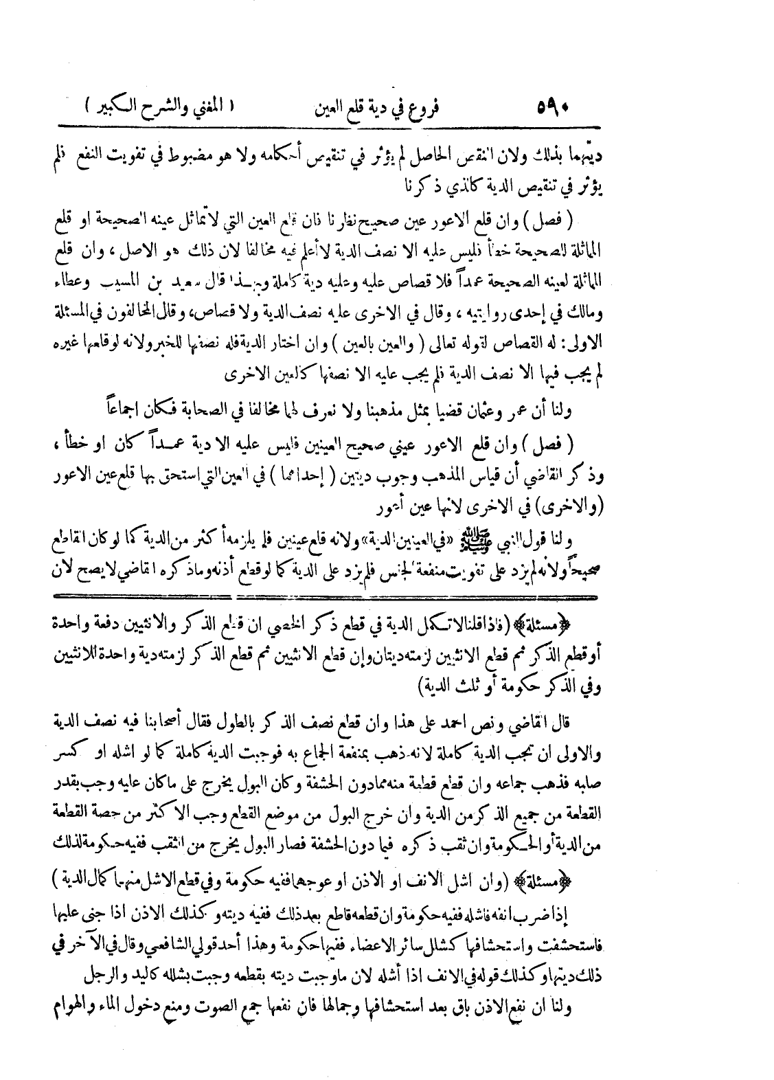 (مسألة) (فإذا قلنا لا تكمل الدية في قطع ذكر الخصي ان قطع الذكر والأنثيين دفعة واحدة أو قطع الذكر ثم قطع الأنثيين لزمته ديتان وإن قطع الأنثيين ثم قطع الذكر لزمته دية واحدة للأنثيين وفي الذكر حكومة أو ثلث الدية) قال القاضي ونص أحمد على هذا وان قطع نصف الذكر بالطول فقال اصحابنا فيه نصف الدية والأولى ان تجب الدية كاملة لأنه ذهب بمنفعة الجماع به فوجبت الدية كاملة كما لو أشله أو كسر صلبه فذهب جماعه وان قطع قطعة منه مما دون الحشفة وكان البول يخرج على ما كان عليه وجب بقدر القطعة من جميع الذكر من الدية وإن خرج البول من موضع القطع وجب الأكثر من حصة القطعة من الدية أو الحكومة وان ثقب ذكره فيما دون الحشفة فصار البول يخرج من الثقب ففيه حكومة لذلك (مسألة) (وإن أشل الأنف أو الأذن أو عوجهما ففيه حكومة وفي قطع الأشل منهما كمال الدية) إذا ضرب أنفه فأشله ففيه حكومة وان قطعه قاطع بعد ذلك ديته وكذلك الأذن اذا جنى عليها فاستحشفت واستحشافها كشلل سائر الأعضاء ففيها حكومة وهذا أحد قولي الشافعي وقال في الآخر في ذلك ديتها وكذلك قوله في الأنف إذا أشله لأن ما وجبت ديته بقطعه وجبت بشلله كاليد والرجل ولنا ان نفع الأذن باق بعد استحشافها وجمالها فإن نفعها جمع الصوت ومنع دخول الماء والهوام