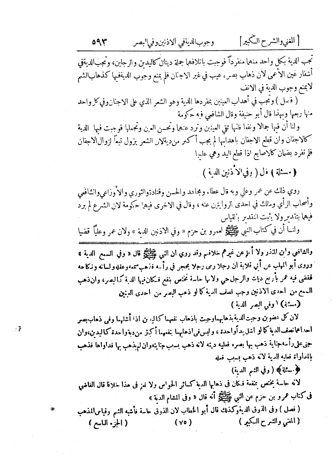 والشافعي وابن المنذر ولا أعلم عن غيرهم خلافهم وقد روي أن النبي صلى الله عليه وسلم قال " وفي السمع الدية " وروى ابو المهلب عن أبي قلابة ان رجلاً رمى رجلاً بحجر في رأسه فذهب سمعه وعقله ولسانه ونكاحه فقضى فيه عمر بأربع ديات والرجل حي ولأنها حاسة تختص بنفع فكان فيها الدية كالبصر، وإن ذهب السمع من إحدى الأذنين وجب نصف الدية كما لو ذهب البصر من إحدى العينين (مسألة) (وفي البصر الدية) لأن كل عضوين وجبت الدية بذهابهما وجبت بإذهاب نفعهما كاليدين إذا أشلهما وفي ذهاب بصر إحداهما نصف الدية كما لو أشل يداً واحدة، وليس في اذهابهما بنفعهما اكثر من دية واحدة كاليدين، وإن جني على رأسه جناية ذهب بها بصره فعليه ديته لأنه ذهب بسبب جنايته وان لم يذهب بها فداواها فذهب بالمداواة فعليه الدية ذهب بسبب فعله (مسألة) (وفي الشم الدية) لأنه حاسة يختص بمنفعة فكان في ذهابها الدية كسائر الحواس ولا نعلم في هذا خلافاً قال القاضي في كتاب عمرو بن حزم عن النبي صلى الله عليه وسلم أنه قال " وفي المشام الدية " (فصل) وفي الذوق الدية وكذلك قال أبو الخطاب لأن الذوق حاسة فأشبه الشم وقياس المذهب