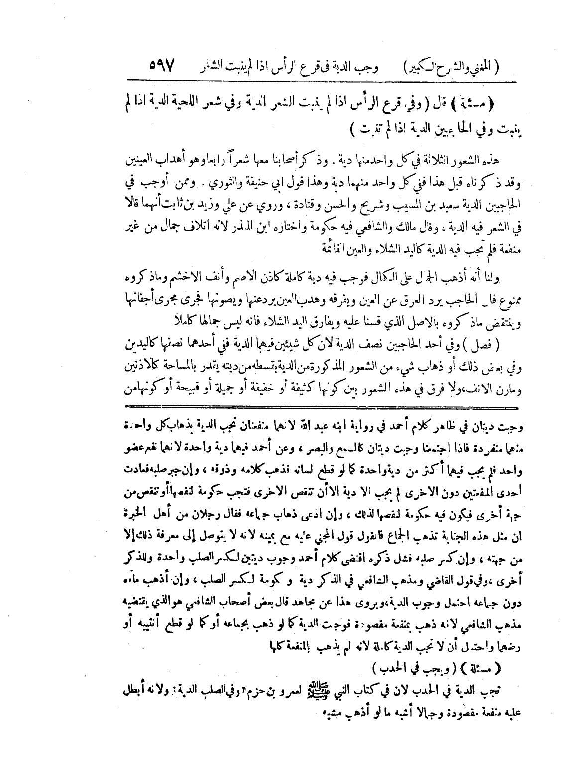 جهة أخرى فيكون فيه حكومة لنقصها لذلك، وان ادعى ذهاب جماعه فقال رجلان من أهل الخبرة ان مثل هذه الجناية تذهب الجماع فالقول قول المجني عليه مع يمينه لأنه لا يتوصل الى معرفة ذلك إلا من جهته، وان كسر صلبه فشل ذكره اقتضى كلام أحمد وجوب ديتين لكسر الصلب واحدة وللذكر اخرى، وفي قول القاضي ومذهب الشافعي في الذكر دية وحكومة لكسر الصلب، وان اذهب ماءه دون جماعة احتمل وجوب الدية، ويروى هذا عن مجاهد قال بعض أصحاب الشافعي هو الذي يقتضيه مذهب الشافعي لأنه ذهب بمنفعة مقصودة فوجبت الدية كما لو ذهب بجماعة أو كما لو قطع أنثييه أو رضهما واحتمل أن لا تجب الدية كاملة لأنه لم يذهب بالمنفعة كلها (مسألة) (ويجب في الحدب) تجب الدية في الحدب لأن في كتاب النبي صلى الله عليه وسلم لعمرو بن حزم " وفي الصلب الدية " ولأنه أبطل عليه منفعة مقصودة وجمالاً أشبه ما لو أذهب مشيه