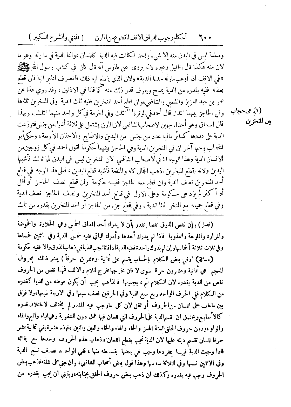 وفي ثلاث ثلاثة أخماسها وإن لم يدرك واحدة فعليه الدية إذا قلنا تجب الدية في ذهاب الذوق وإلا ففيه حكومة (مسألة) (وفي بعض الكلام بالحساب يقسم على ثمانية وعشرين حرفاً) يعتبر ذلك بحروف المعجم هي ثمانية وعشرون حرفاً سوى لا فإن مخرجها مخرج الام والألف فمهما نقص من الحروف نقص من الدية بقدره لأن الكلام تم، بجميعها فالذاهب يجب أن يكون عوضه من الدية كقدره من الكلام ففي الحرف الواحد ربع سبع الدية وفي الحرفين نصف سبعها وفي الأربعة سبعها، ولا فرق بين ما خف على اللسان من الحروف أو ثقل لأن كل ما وجب فيه المقدر لم يختلف لاختلاف قدره كالأصابع ويحتمل ان تقسم الدية على الحروف التي للسان فيها عمل دون الشفوية وهي الباء والميم والفاء والواو، ودون حروف الحلق السنة الهمز والحاء والخاء والعين والغين، فهذه عشرة بقي ثمانية عشر حرفا للسان تقسم ديته عليها لأن الدية تجب بقطع اللسان وذهاب هذه الحروف وحدها مع بقائه فإذا وجبت الدية فيها بمفردها وجب في بعضها بقسطه منها، ففي الواحد نصف تسع الدية وفي الاثنين تسعها وفي الثلاثة سدسها وهذا قول بعض أصحاب الشافعي، وإن جني على شفته فذهب بعض الحروف وجب فيه بقدره وكذلك إن ذهب بعض حروف الحلق بجنايته، وينبغي ان يجب بقدره من