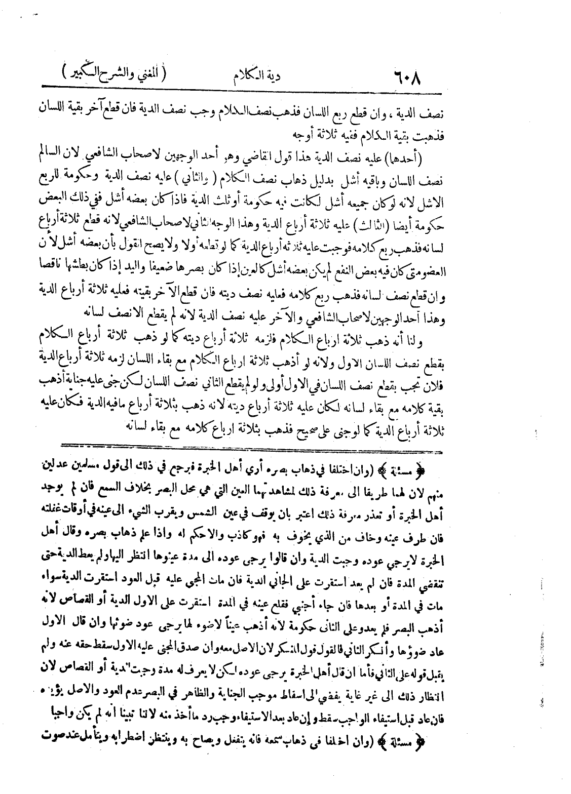 (مسألة) (وإن اختلفا في ذهاب بصره أري أهل الخبرة فيرجع في ذلك إلى قول مسلمين عدلين منهم لأن لهما طريقاً الى معرفة ذلك لمشاهدتهما العين التي هي محل البصر بخلاف السمع فإن لم يوجد أهل الخبرة أو تعذر معرفة ذلك اعتبر بأن يوقف في عين الشمس ويقرب الشئ الى عينه في أوقات غفلته فإن طرف عينه وخاف من الذي يخوف به فهو كاذب ولا حكم له واذا علم ذهاب بصره وقال اهل الخبرة لا يرجى عوده وجبت الدية وان قالوا يرجى عوده الى مدة عينوها انتظر اليها ولم يعط الدية حتى تنقضي المدة فإن لم يعد استقرت على الجاني الدية فإن مات المجني عليه قبل العود استقرت الدية سواء مات في المدة أو بعدها فإن جاء اجنبي فقلع عينه في المدة استقرت على الأول الدية أو القصاص لأنه أذهب البصر فلم يعدو على الثاني حكومة لأنه أذهب عيناً لا ضوء لها يرجى عود ضوئها وان قال الأول عاد ضوؤها وأنكر الثاني فالقول قول المنكر لأن الأصل معه وأن صدق المجني عليه الأول سقط حقه عنه ولم يقبل قوله على الثاني فأما إن قال أهل الخبرة يرجى عوده لكن لا يعرف له مدة وجبت الدية أو القصاص لأن انتظار ذلك الى غير غاية يفضي الى اسقاط موجب الجناية والظاهر في البصر عدم العود والأصل يؤيده فإن عاد قبل استيفاء الواجب سقط وان عاد بعد الاستيفاء وجب رد ما أخذ منه لأننا تبينا أنه لم يكن واجباً (مسألة) (وإن اختلفا في ذهاب سمعه فانه ينفعل ويصاح به وينتظر اضطرابه ويتأمل عند صوت