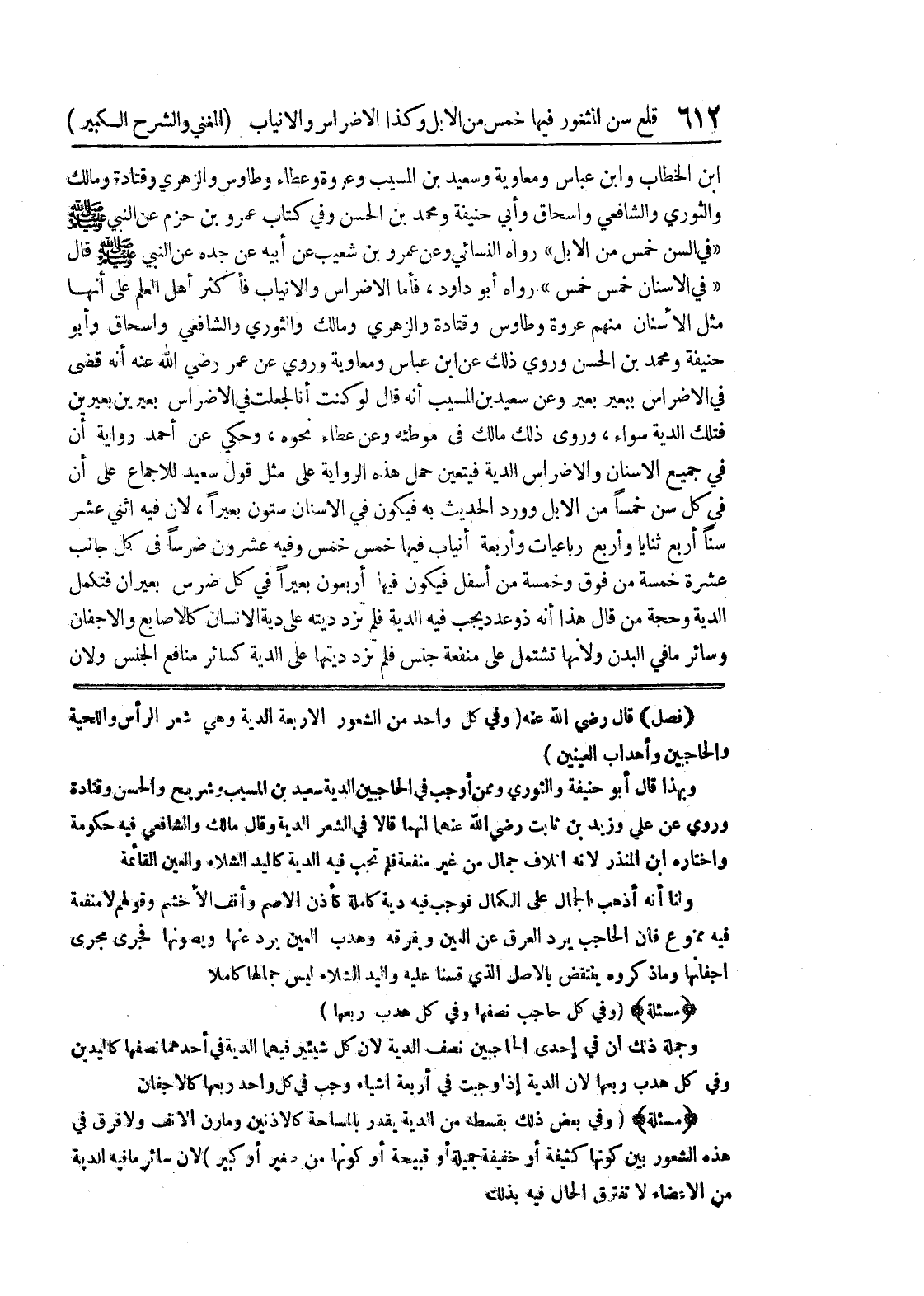 (فصل) قال رضي الله عنه (وفي كل واحد من الشعور الاربعة الدية وهي شعر الراس واللحية والحاجبين وأهداب العينين) وبهذا قال أبو حنيفة والثوري وممن اوجب في الحاجبين الدية سعيد بن المسيب وشريح والحسن وقتادة وروي عن علي وزيد بن ثابت رضي الله عنهما أنهما قالا في الشعر الدية وقال مالك والشافعي فيه حكومة واختاره ابن المنذر لأنه إتلاف جمال من غير منفعة فلم تجب الدية كاليد الشلاء والعين القائمة ولنا أنه أذهب الجمال على الكمال فوجب فيه دية كاملة كأذن الأصم وأنف الأخشم وقولهم لا منفعة فيه ممنوع فإن الحاجب يرد العرق عين العين ويفرقه وهدب العين يرد عنها ويصونها فجرى مجرى أجفانها وما ذكروه ينتقض بالأصل الذي قسنا عليه واليد الشلاء ليس جمالها كاملاً (مسألة) (وفي كل حاجب نصفها وفي كل هدب ربعها) وجملة ذلك أن في إحدى الحاجبين نصف الدية لأن كل شيئين فيهما الدية في احدهما نصفها كاليدين وفي كل هدب ربعها لأن الدية إذا وجبت في أربعة أشياء وجب في كل واحد ربعها كالأجفان (مسألة) (وفي بعض ذلك بقسطه من الدية يقدر بالمساحة كالأذنين ومارن الأنف ولا فرق في هذه الشعور بين كونها كثيفة أو خفيفة جملية أو قبيحة أو كونها من صغير أو كبير) لأن سائر ما فيه الدية من الأعضاء لا تفترق الحال فيه بذلك