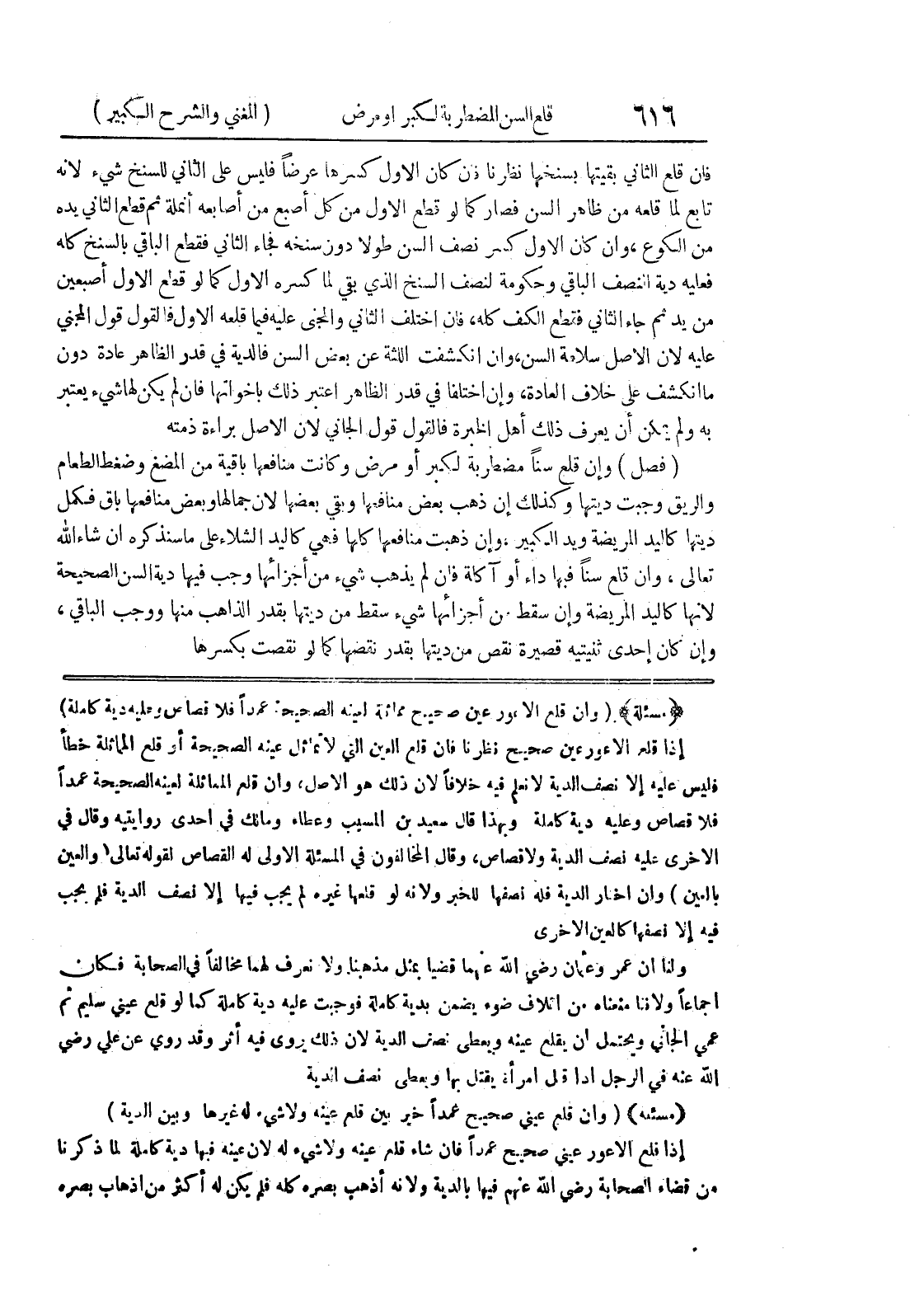 (مسألة) (وإن قلع الأعور عين صحيح مماثلة لعينه الصحيحة عمداً فلا قصاص وعليه دية كاملة) إذا قلع الأعور عين صحيح نظرنا فإن قلع العين التي لا تماثل عينه الصحيحة أو قلع المماثلة خطأ فليس عليه إلا نصف الدية لا نعلم فيه خلافاً لأن ذلك هو الأصل، وأن قلع المماثلة لعينه الصحيحة عمداً فلا قصاص وعليه دية كاملة وبهذا قال سعيد بن المسيب وعطاء ومالك في إحدى روايتيه وقال في الأخرى عليه نصف الدية ولا قصاص، وقال المخالفون في المسألة الأولى له القصاص لقوله تعالى (والعين بالعين) وان اخبار الدية فله نصفها للخبر ولأنه لو قلعها غيره لم يجب فيها إلا نصف الدية فلم يجب فيه إلا نصفها كالعين الأخرى ولنا عن عمر وعثمان رضي الله عنهما قضيا بمثل مذهبنا ولا نعرف لهما مخالفاً في الصحابة فكان إجماعاً ولأننا منعناه من إتلاف ضوء يضمن بدية كاملة فوجبت عليه دية كاملة كما لو قلع عيني سليم ثم عمي الجاني ويتحمل أن يقلع عينه ويعطى نصف الدية لأن ذلك يروي فيه أثر وقد روي عن علي رضي الله عنه في الرجل إذا قتل امرأة يقتل بها ويعطى نصف الدية (مسألة) (وإن قلع عيني صحيح عمداً خير بين قلع عينه ولا شئ له غيرها وبين الدية) إذا قلع الأعور عيني صحيح عمداً فإن شاء قلع عينه ولا شئ له لأن عينه له فيها دية كاملة لما ذكرنا من قضاء الصحابة رضي الله عنهم فيها بالدية ولأنه أذهب بصره كله فلم يكن له أكثر من إذهاب بصره