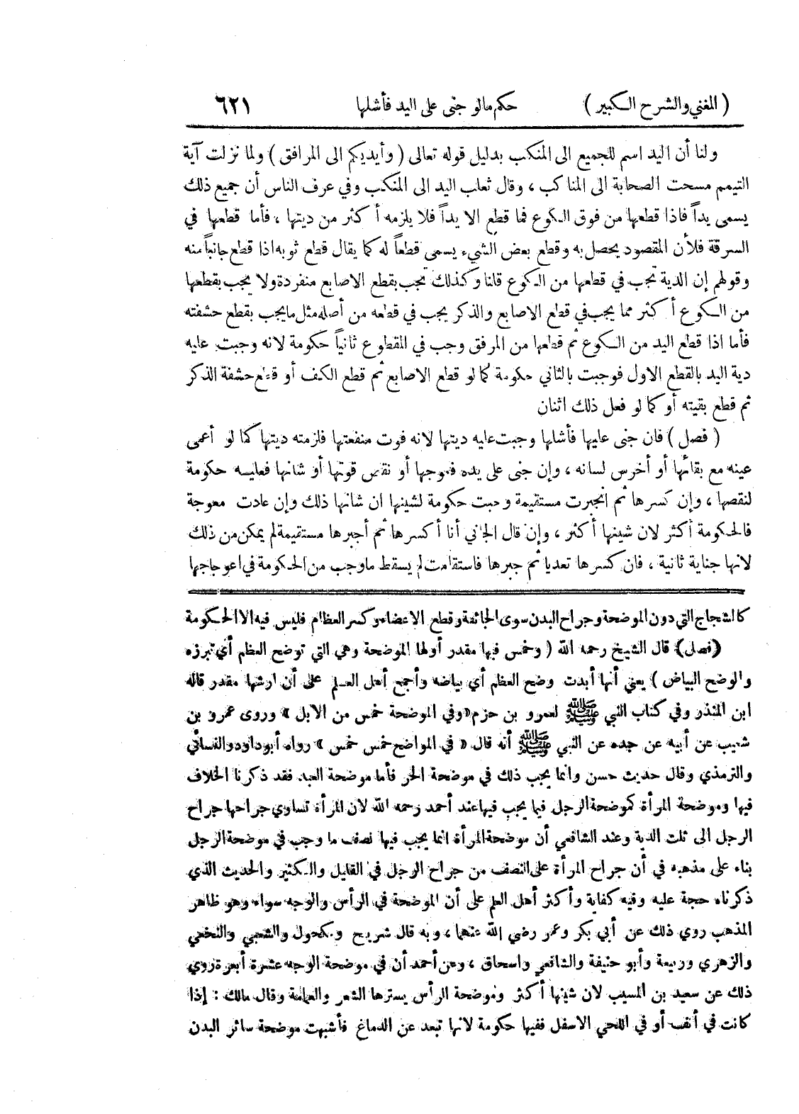 كالشجاج التي دون الموضحة وجراح البدن سوى الجائفة وقطع الأعضاء وكسر العظام فليس فيه إلا الحكومة (فصل) قال الشيخ رحمه الله (وخمس فيها مقدر أولها الموضحة وهي التي توضح العظم أي تبرزه والوضح البياض) يعني أنها أبدت وضح العظم أي بياضه وأجمع أهل العلم على أن أرشها مقدر قاله ابن المنذر وفي كتاب النبي صلى الله عليه وسلم لعمرو بن حزم " وفي الموضحة خمس من الإبل " وروى عمرو بن شعيب عن أبيه عن جده عن النبي صلى الله عليه وسلم أنه قال " في المواضح خمس خمس " رواه أبو داود والنسائي والترمذي وقال حديث حسن وأنما يجب ذلك في موضحة الحر فأما موضحة العبد فقد ذكرنا الخلاف فيها وموضحة المرأة كموضحة الرجل فيما يجب فيها عند أحمد رحمه الله لأن المرأة تساوي جراحها جراح الرجل إلى ثلث الدية وعند الشافعي أن موضحة المرأة إنما يجب فيها نصف ما وجب في موضحة الرجل بناء على مذهبه في أن جراح المرأة على النصف من جراح الرجل في القليل والكثير والحديث الذي ذكرناه حجة عليه وفيه كفاية وأكثر أهل العلم على أن الموضحة في الرأس والوجه سواء وهو ظاهر المذهب روى ذلك عن ابي بكر وعمر رضي الله عنهما، وبه قال شريح ومكحول والشعبي والنخعي والزهري وربيعة وأبو حنيفة والشافعي وإسحاق، وعن أحمد أن في موضحة الوجه عشرة أبعرة روى ذلك عن سعيد بن المسيب لأن شينها أكثر وموضحة الرأس يسترها الشعر والعمامة وقال مالك: إذا كانت في أنف أو في اللحي الأسفل ففيها حكومة لأنها تبعد عن الدماغ فأشبهت موضحة سائر البدن