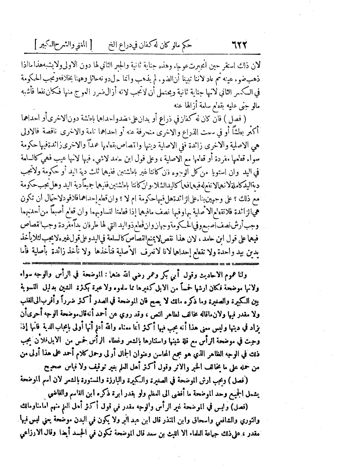 ولأنها موضحة فكان أرشها خمساً من الإبل كغيرها مما سلموه ولا عبرة بكثرة الشين بدليل التسوية بين الكبيرة والصغيرة وما ذكرناه مالك لا يصح فإن الموضحة في الصدر أكثر ضرراً وأقرب الى القلب ولا مقدر فيها ولأن ما قاله مخالف لظاهر النص، وقد روي عن أحمد أنه قال موضحة الوجه أحرى أن يزاد في ديتها وليس معنى هذا أنه يجب فيها أكثر إنما معناه والله أعلم أولى بإيجاب الدية فإنها إذا وجبت في موضحة الراس مع قلة شينها واستتارها بالشعر وغطاء الرأس خمس من الإبل فلأن يجب ذلك في الوجه الظاهر الذي هو مجمع المحاسن وعنوان الجمال أولى وحمل كلام أحمد على هذا أولى من من حمله على ما يخالف الخبر والأثر وقول أكثر أهل العلم بغير توقيف ولا قياس صحيح (فصل) ويجب أرش الموضحة في الصغيرة والكبيرة والبارزة والمستورة بالشعر لأن اسم الموضحة يشمل الجميع وحد الموضحة ما أفضى الى العظم ولو بقدر ابرة ذكره ابن القاسم والقاضي (فصل) وليس في الموضحة غير الرأس والوجه مقدر في قول أكثر أهل العلم منهم إمامنا ومالك والثوري والشافعي واسحاق وابن المنذر قال ابن عبد البر ولا يكون في البدن موضحة يعني ليس فيها مقدر، على ذلك جماعة العلماء إلا الليث بن سعد قال الموضحة تكون في الجسد ايضاً وقال الأوزاعي