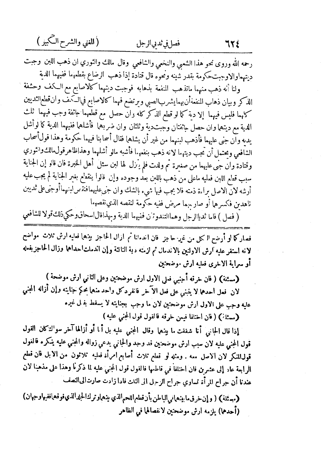 ومثله لو قطع ثلاث اصابع امرأة فعليه ثلاثون من الإبل فإن قطع الرابعة عاد الى عشرين فإن اختلفا في قاطعها فالقول قول المجني عليه لما ذكرنا وهذا على مذهبنا لأن عندنا أن جراح المرأة تساوي جراح الرجل إلى الثلث فإذا زادت صارت الى النصف (مسألة) (وإن خرق ما بينهما في الباطن بأن قطع اللحم الذي بينهما وترك الجلد الذي فوقهما ففيها وجهان) (أحدهما) يلزمه أرش موضحتين لانفصالهما في الظاهر