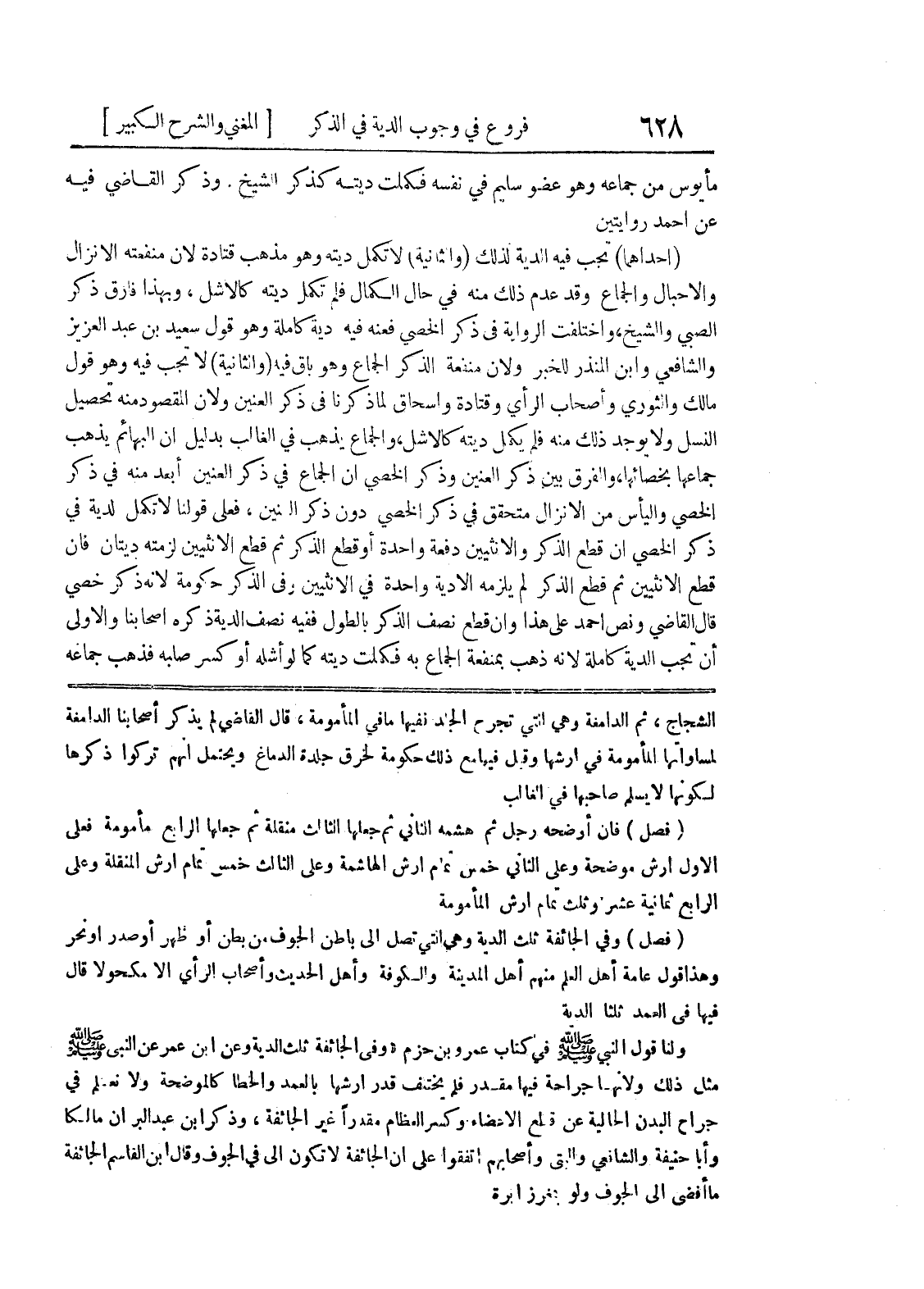 الشجاج، ثم الدامغة وهي التي تجرح الجلد ففيها ما في المأمومة، قال القاضي لم يذكر أصحابنا الدامغة لمساواتها المأمومة في ارشها وقيل فيها مع ذلك حكومة لخرق جلدة الدماغ ويحتمل أنهم تركوا ذكرها لكونها لا يسلم صاحبها في الغالب (فصل) فإن أوضحه رجل ثم هشمه الثاني ثم جعلها الثالث منقلة ثم جعلها الرابع مأمومة فعلى الأول ارش موضحة وعلى الثاني خمس تمام أرش الهاشمة وعلى الثالث خمس تمام أرش المنقلة وعلى الرابع ثمانية عشر وثلث تمام أرش المأمومة (فصل) وفي الجائفة ثلث الدية وهي التي تصل الى باطن الجوف من بطن أو ظهر أو صدر او نحر وهذا قول عامة أهل العلم منهم أهل المدينة والكوفة وأهل الحديث وأصحاب الرأي إلا مكحولاً قال فيها في العمد ثلثا الدية ولنا قول النبي صلى الله عليه وسلم في كتاب عمرو بن حزم " وفي الجائفة ثلث الدية " وعن ابن عمر عن النبي صلى الله عليه وسلم مثل ذلك ولانهما جراحة فيها مقدر فلم يختلف قدر ارشها بالعمد والخطأ كالموضحة ولا نعلم في جراح البدن الحالية عن قطع الأعضاء وكسر العظام مقدراً غير الجائفة، وذكر ابن عبد البر ان مالكا وأبا حنيفة والشافعي والتى واصحابهم اتفقوا على أن الجائفة لا تكون إلى في الجوف وقال ابن القاسم الجائفة ما أفضى الى الجوف ولو بمغرز إبرة