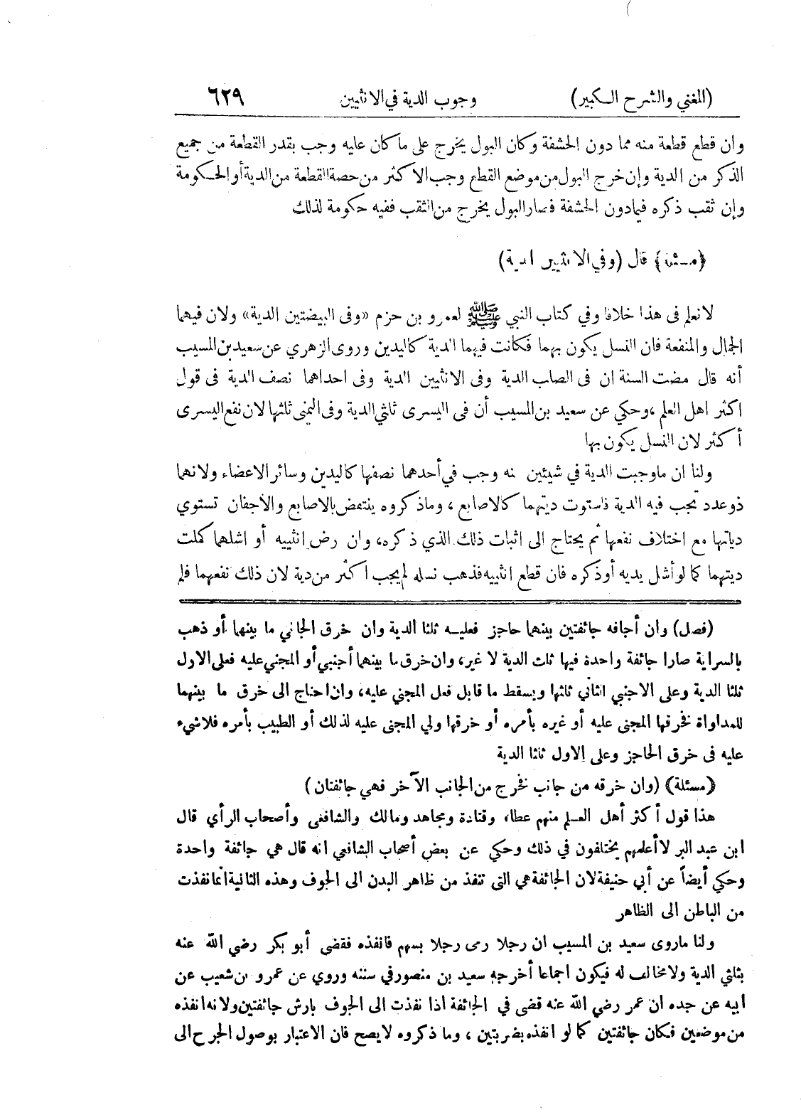 ابن عبد البر لا أعلمهم يختلفون في ذلك وحكي عن بعض أصحاب الشافعي أنه قال هي جائفة واحدة وحكي أيضاً عن أبي حنيفة لأن الجائفة هي التي تنفذ من ظاهر البدن الى الجوف وهذه الثانية انما نفذت من الباطن الى الظاهر ولنا ما روى سعيد بن المسيب ان رجلاً رمى رجلاً بسهم فأنفذه فقضى ابو بكر رضي الله عنه بثلثي الدية ولا مخالف له فيكون إجماعاً أخرجه سعيد بن منصور في سننه وروي عن عمرو بن شعيب عن أبيه عن جده أن عمر رضي الله عنه قضى في الجائفة إذا نفذت الى الجوف بأرش جائفتين ولأنه أنفذه من موضعين فكان جائفتين كما لو أنفذه بضربتين، وما ذكروه لا يصح فإن الاعتبار بوصول الجرح الى
