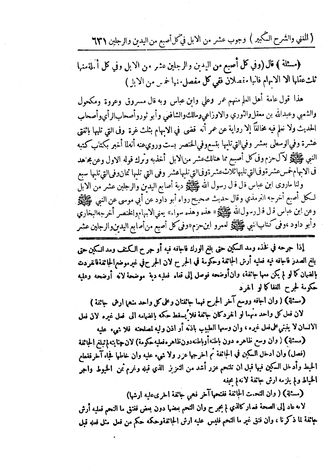 إذا جرحه في فخذه ومد السكين حتى بلغ الورك فأجافه فيه أو جرح الكتف ومد السكين حتى بلغ الصدر فأجافه فيه فعليه أرش الجائفة وحكومة في الجرح لأن الجرح في غير موضع الجائفة فانفردت بالضمان كما لو لم يكن معها جائفة، وأن أوضحه فوصل الى قفاه فعليه دية موضحة لأنه أوضحه وعليه حكومة لجرح القفا كما لو انفرد (مسألة) (وان أجافه ووسع آخر الجرح فهما جائفتان وعلى كل واحد منهما أرش جائفة) لأن فعل كل واحد منهما لو انفرد كان جائفة فلا يسقط حكمه بانضمامه الى فعل غيره لأن فعل الإنسان لا ينبني على فعل غيره، وإن وسعها الطبيب بإذنه أو إذن وليه فلا شئ عليه (مسألة) (وإن وسع ظاهره دون باطنه أو باطنه دون ظاهره فعليه حكومة) لأن جنايته لم تبلغ الجائفة (فصل) وإن أدخل السكين في الجائفة ثم أخرجها عزر ولا شئ عليه وإن خاطها فجاء آخر فقطع الخيط وأدخل السكين فيها قبل أن تلتحم عزر أشد من التعزير الذي قبله وغرم ثمن الخيوط وأجر الخياط ولم يلزمه أرش جائفة لأنه لم يجفه (مسألة) (وإن التحمت الجائفة ففتحها آخر فهي جائفة أخرى عليه أرشها) لأنه عاد إلى الصحة فصار كالذي لم يجرح وان التحم بعضها دون بعض ففتق ما التحم فعليه أرش جائفة لما ذكرنا، وإن فتق غير ما التحم فليس عليه أرش الجائفة وحكمه حكم من فعل مثل فعله قبل