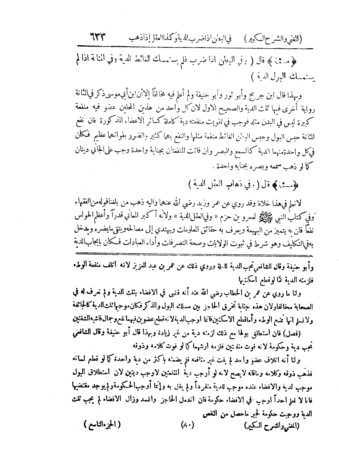 وأبو حنيفة وقال الشافعي تجب الدية كاملة وروي ذلك عن عمر بن عبد العزيز لأنه أتلف منفعة الوطئ فلزمته الدية كما لو قطع إسكتيها ولنا ما روى عن عمر بن الخطاب رضي الله عنه أنه قضى في الإفضاء بثلث الدية ولم نعرف له في الصحابة مخالفاً ولأن هذه جناية تخرق الحاجز بين مسلك البول والذكر فكان موجبها ثلث الدية كالجائفة ولا نسلم أنها تمنع الوطئ وأما قطع الإسكتين فإنما أوجب الدية لأنه قطع عضوين فيهما نفع وجمال فأشبه الشفتين (فصل) فإن استطلق بولها مع ذلك لزمته دية من غير زيادة وبهذا قال أبو حنيفة وقال الشافعي تجب دية وحكومة لأنه فوت منفعتين فلزمه أرشهما كما لو فوت كلامه وذوقه ولنا أنه إتلاف عضو واحد لم يفت غير منافعه فلم يضمنه بأكثر من دية واحدة كما لو قطع لسانه فذهب ذوقه وكلامه وما قاله لا يصح لأنه لو أوجب دية المنفعتين لأوجب ديتين لأن استطلاق البول موجب لدية والإفضاء عنده موجب للدية منفرداً ولم يقل به وإنما أوجب الحكومة ولم يوجد مقتضيها فإنا لا نعلم أحدا أوجب في الإفضاء حكومة فإن اندمل الحاجز وانسد وزال الافضاء لم يحدث ثلث
