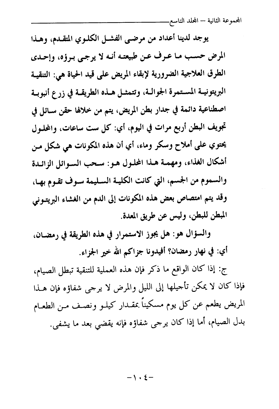 ج: إذا كان الواقع ما ذكر فإن هذه العملية للتنقية تبطل الصيام، فإذا كان لا يمكن تأجيلها إلى الليل والمرض لا يرجى شفاؤه فإن هذا المريض يطعم عن كل يوم مسكينا بمقدار كيلو ونصف من الطعام بدل الصيام، أما إذا كان يرجى شفاؤه فإنه يقضي بعد ما يشفى.