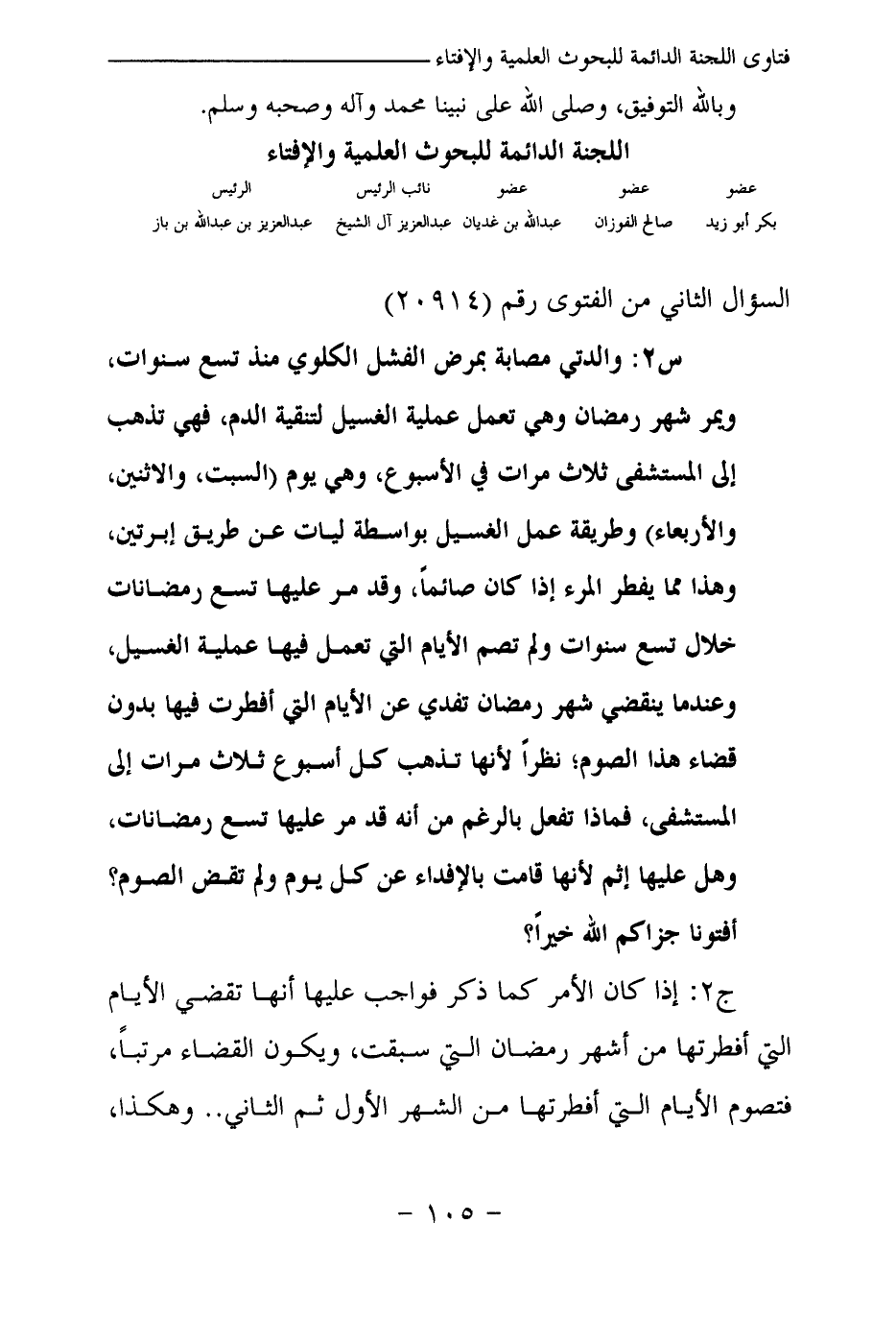 س2: والدتي مصابة بمرض الفشل الكلوي منذ تسع سنوات، ويمر شهر رمضان وهي تعمل عملية الغسيل لتنقية الدم، فهي تذهب إلى المستشفى ثلاث مرات في الأسبوع، وهي يوم (السبت، والاثنين، والأربعاء) وطريقة عمل الغسيل بواسطة ليات عن طريق إبرتين، وهذا مما يفطر المرء إذا كان صائما، وقد مر عليها تسع رمضانات خلال تسع سنوات ولم تصم الأيام التي تعمل فيها عملية الغسيل، وعندما ينقضي شهر رمضان تفدي عن الأيام التي أفطرت فيها بدون قضاء هذا الصوم؛ نظرا لأنها تذهب كل أسبوع ثلاث مرات إلى المستشفى، فماذا تفعل بالرغم من أنه قد مر عليها تسع رمضانات، وهل عليها إثم؛ لأنها قامت بالإفداء عن كل يوم ولم تقض الصوم؟ أفتونا جزاكم الله خيرا؟