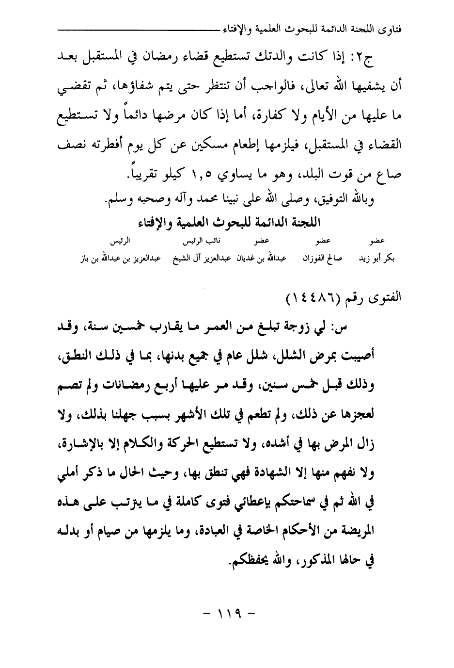 س: لي زوجة تبلغ من العمر ما يقارب خمسين سنة، وقد أصيبت بمرض الشلل، شلل عام في جميع بدنها، بما في ذلك النطق، وذلك قبل خمس سنين، وقد مر عليها أربع رمضانات ولم تصم لعجزها عن ذلك، ولم تطعم في تلك الأشهر بسبب جهلنا بذلك، ولا زال المرض بها في أشده، ولا تستطيع الحركة والكلام إلا بالإشارة، ولا نفهم منها إلا الشهادة فهي تنطق بها، وحيث الحال ما ذكر أملي في الله ثم في سماحتكم بإعطائي فتوى كاملة في ما يترتب على هذه المريضة من الأحكام الخاصة في العبادة، وما يلزمها من صيام أو بدله في حالها المذكور، والله يحفظكم.