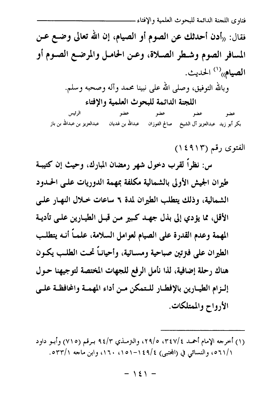 س: نظرا لقرب دخول شهر رمضان المبارك، وحيث إن كتيبة طيران الجيش الأولى بالشمالية مكلفة بمهمة الدوريات على الحدود الشمالية، وذلك يتطلب الطيران لمدة 6 ساعات خلال النهار على الأقل، مما يؤدي إلى بذل جهد كبير من قبل الطيارين على تأدية المهمة وعدم القدرة على الصيام لعوامل السلامة، علما أنه يتطلب الطيران على فترتين صباحية ومسائية، وأحيانا تحت الطلب يكون هناك رحلة إضافية، لذا نأمل الرفع للجهات المختصة لتوجيهنا حول إلزام الطيارين بالإفطار؛ للتمكن من أداء المهمة، والمحافظة على الأرواح والممتلكات.
