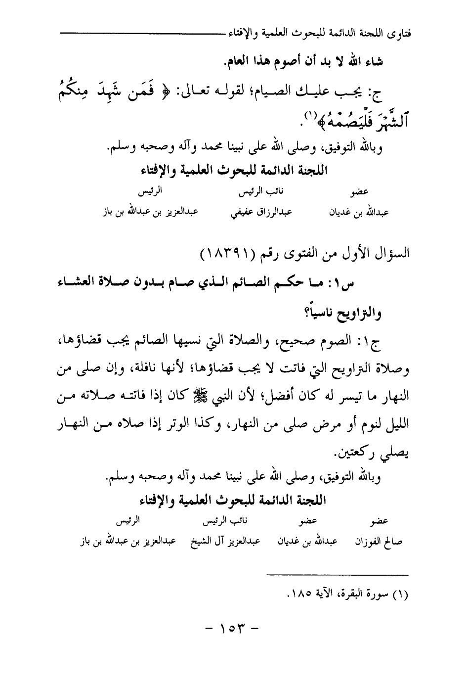 س1: ما حكم الصائم الذي صام بدون صلاة العشاء والتراويح ناسيا؟