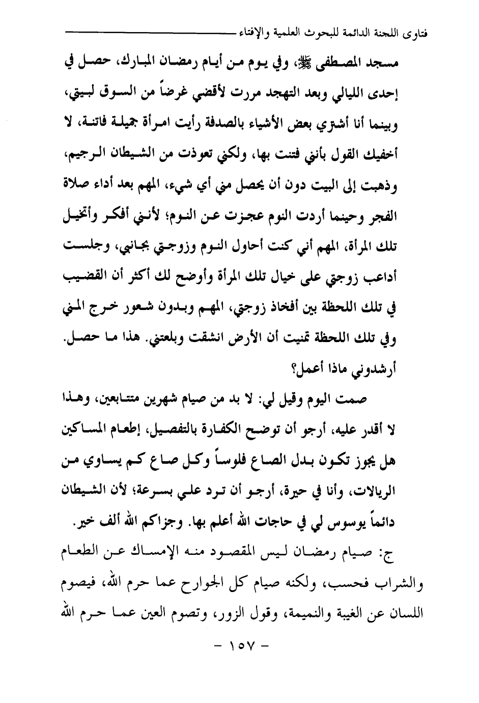مسجد المصطفى صلى الله عليه وسلم، وفي يوم من أيام رمضان المبارك، حصل في إحدى الليالي وبعد التهجد مررت لأقضي غرضا من السوق لبيتي، وبينما أنا أشتري بعض الأشياء بالصدفة رأيت امرأة جميلة فاتنة، لا أخفيك القول بأنني فتنت بها، ولكني تعوذت من الشيطان الرجيم، وذهبت إلى البيت دون أن يحصل مني أي شيء المهم بعد أداء صلاة الفجر، وحينما أردت النوم عجزت عن النوم؛ لأنني أفكر وأتخيل تلك المرأة، المهم أني كنت أحاول النوم وزوجتي بجانبي، وجلست أداعب زوجتي على خيال تلك المرأة وأوضح لك أكثر أن القضيب في تلك اللحظة بين أفخاذ زوجتي، المهم وبدون شعور خرج المني، وفي تلك اللحظة تمنيت أن الأرض انشقت وبلعتني. هذا ما حصل. أرشدوني ماذا أعمل؟