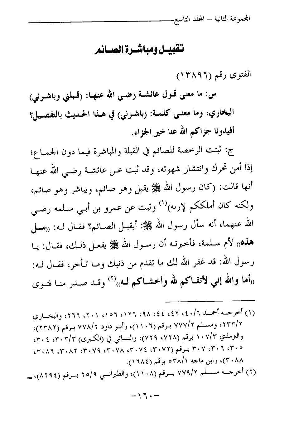 ج: ثبتت الرخصة للصائم في القبلة والمباشرة فيما دون الجماع؛ إذا أمن تحرك وانتشار شهوته، وقد ثبت عن عائشة رضي الله عنها أنها قالت: «كان رسول الله صلى الله عليه وسلم يقبل وهو صائم، ويباشر وهو صائم، ولكنه كان أملككم لإربه (¬2) » وثبت عن عمرو بن أبي سلمة رضي الله عنهما، «أنه سأل رسول الله صلى الله عليه وسلم: أيقبل الصائم؟ فقال له: سل هذه لأم سلمة، فأخبرته أن رسول الله صلى الله عليه وسلم يفعل ذلك، فقال: يا رسول الله، قد غفر الله لك ما تقدم من ذنبك وما تأخر، فقال له: أما والله إني لأتقاكم لله وأخشاكم له (¬3) » وقد صدر منا فتوى