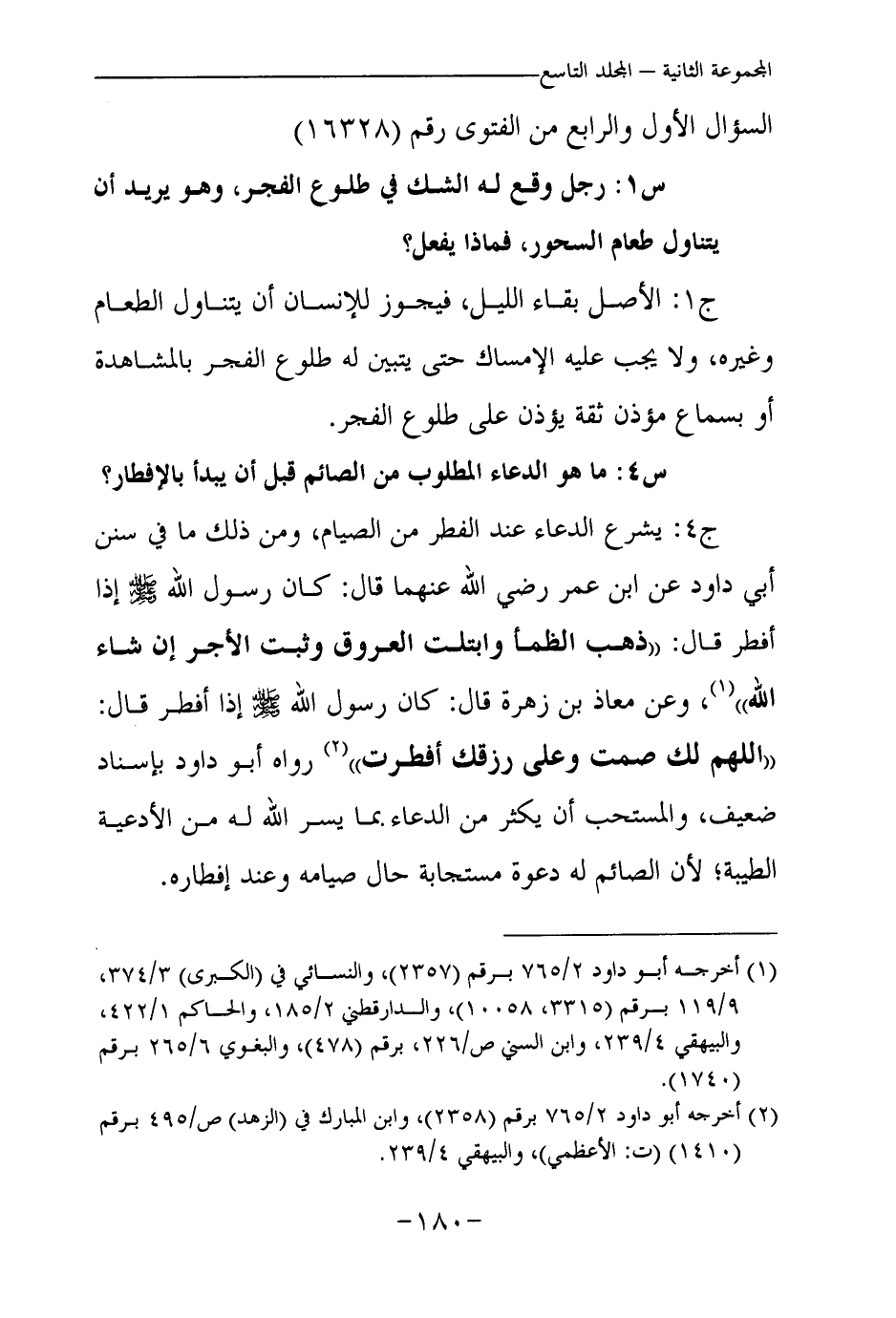 ج4: يشرع الدعاء عند الفطر من الصيام، ومن ذلك ما في سنن أبي داود عن ابن عمر رضي الله عنهما قال: «كان رسول الله صلى الله عليه وسلم إذا أفطر قال: ذهب الظمأ وابتلت العروق وثبت الأجر إن شاء الله (¬1) » وعن معاذ بن زهرة قال: «كان رسول الله صلى الله عليه وسلم إذا أفطر قال: اللهم لك صمت وعلى رزقك أفطرت (¬2) » رواه أبو داود بإسناد ضعيف، والمستحب أن يكثر من الدعاء بما يسر الله له من الأدعية الطيبة؛ لأن الصائم له دعوة مستجابة حال صيامه وعند إفطاره.