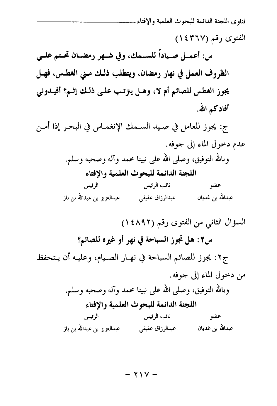 ج: يجوز للعامل في صيد السمك الانغماس في البحر إذا أمن عدم دخول الماء إلى جوفه.