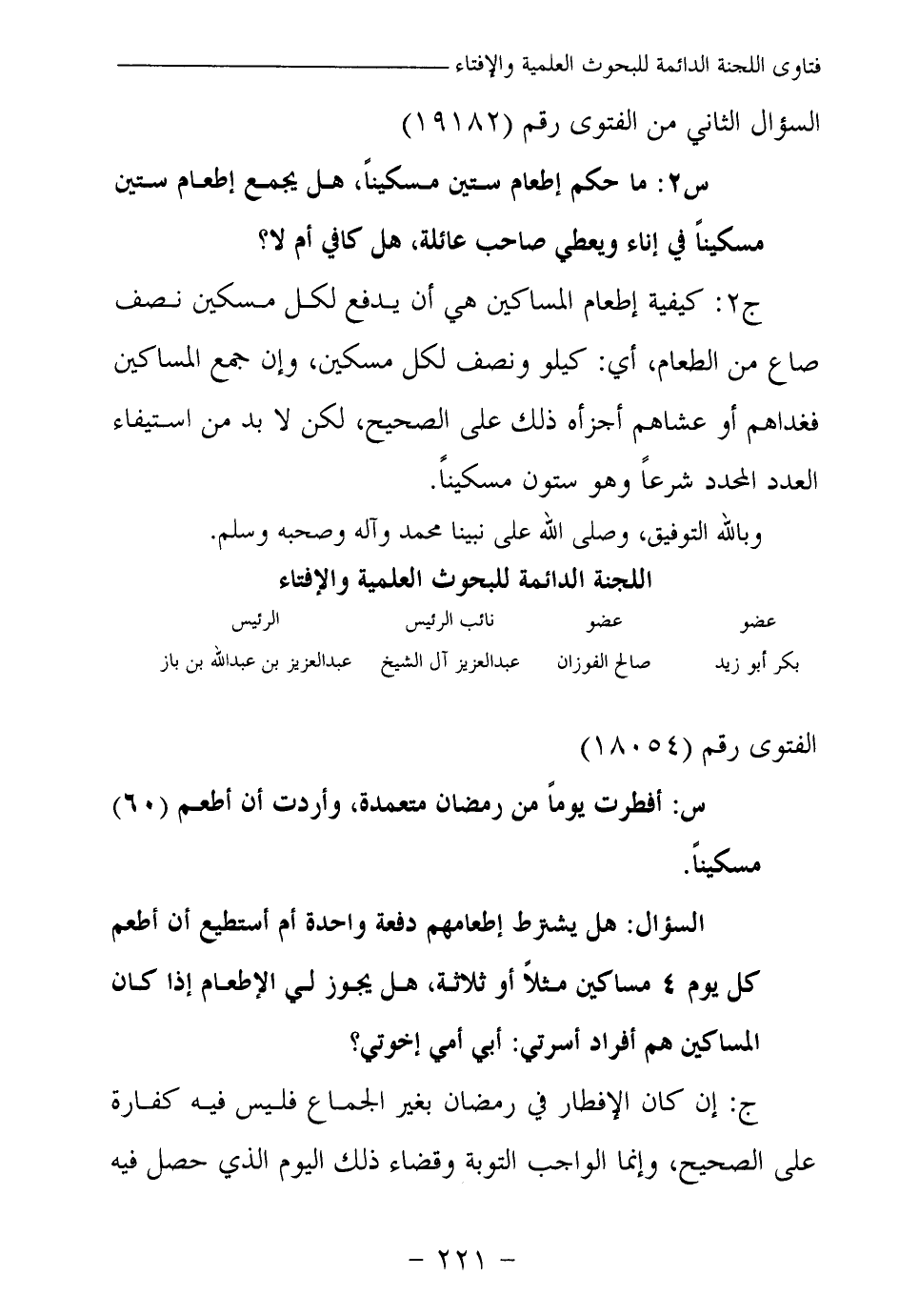 السؤال: هل يشترط إطعامهم دفعة واحدة أم أستطيع أن أطعم كل يوم 4 مساكين مثلا أو ثلاثة، هل يجوز لي الإطعام إذا كان المساكين هم أفراد أسرتي: أبي أمي إخوتي؟