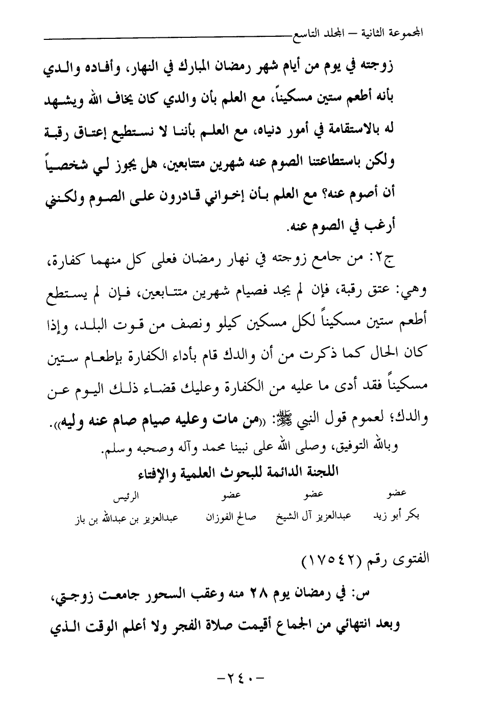 ج2: من جامع زوجته في نهار رمضان فعلى كل منهما كفارة، وهي: عتق رقبة، فإن لم يجد فصيام شهرين متتابعين، فإن لم يستطع أطعم ستين مسكينا لكل مسكين كيلو ونصف من قوت البلد، وإذا كان الحال كما ذكرت من أن والدك قام بأداء الكفارة بإطعام ستين مسكينا فقد أدى ما عليه من الكفارة وعليك قضاء ذلك اليوم عن والدك؛ لعموم قول النبي صلى الله عليه وسلم: «من مات وعليه صيام صام عنه وليه (¬1) » .