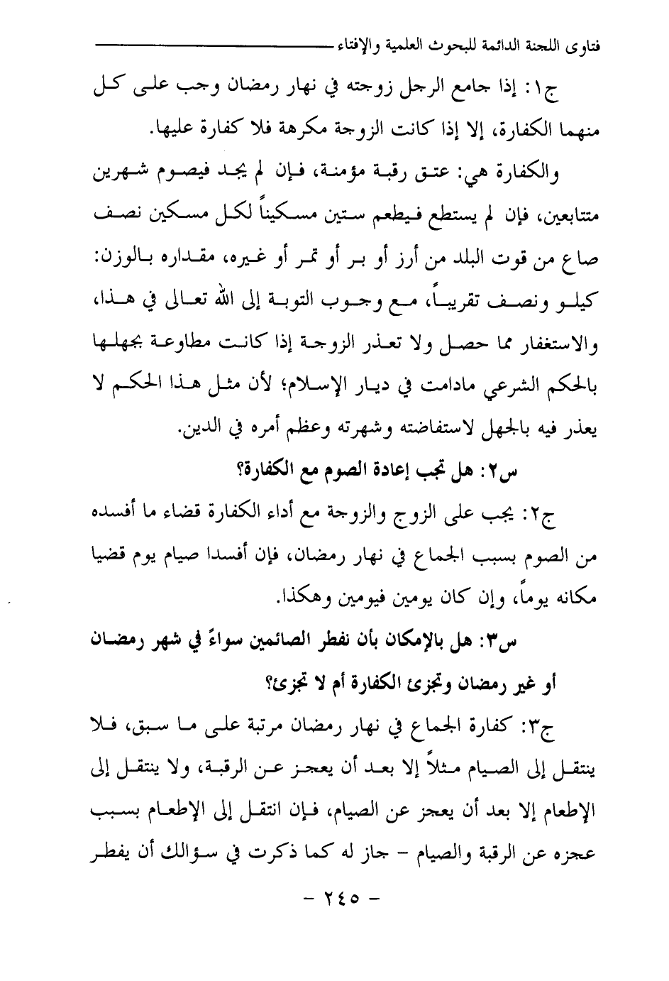 ج1: إذا جامع الرجل زوجته في نهار رمضان وجب على كل منهما الكفارة، إلا إذا كانت الزوجة مكرهة فلا كفارة عليها.