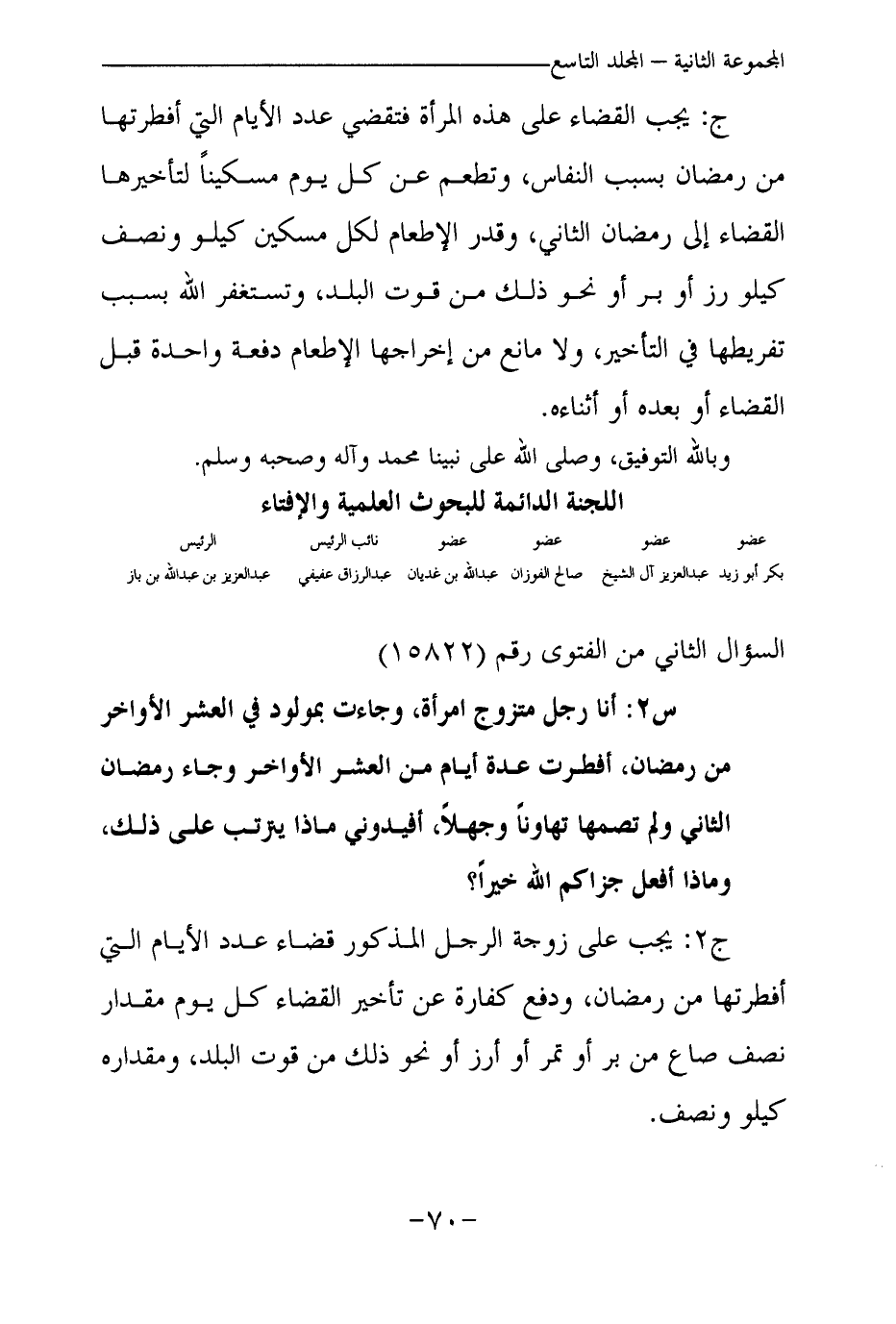 ج2: يجب على زوجة الرجل المذكور قضاء عدد الأيام التي أفطرتها من رمضان، ودفع كفارة عن تأخير القضاء كل يوم مقدار نصف صاع من بر أو تمر أو أرز أو نحو ذلك من قوت البلد، ومقداره كيلو ونصف.