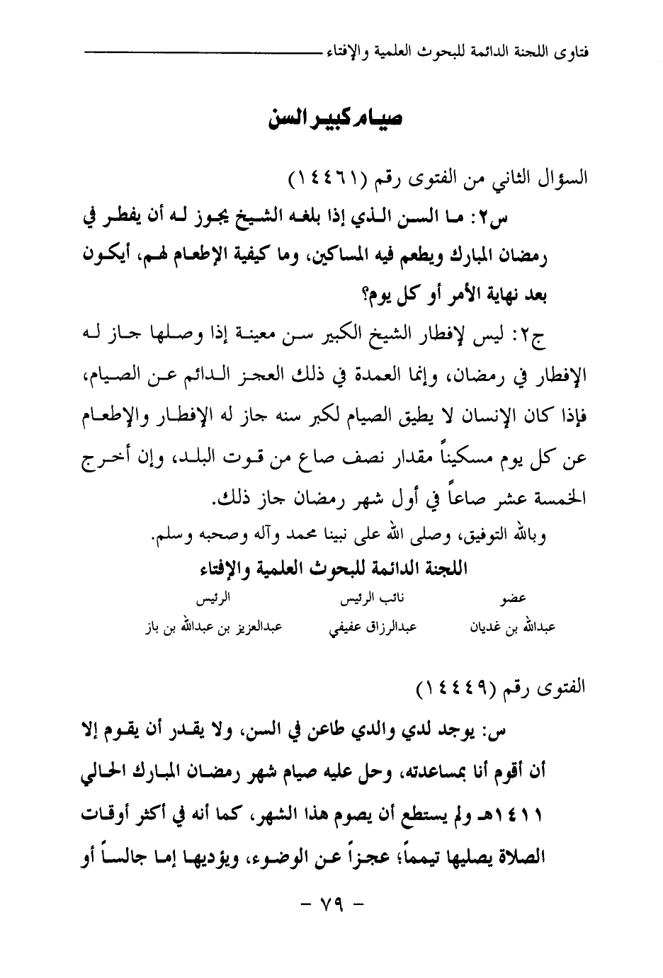 ج2: ليس لإفطار الشيخ الكبير سن معينة إذا وصلها جاز له الإفطار في رمضان، وإنما العمدة في ذلك العجز الدائم عن الصيام، فإذا كان الإنسان لا يطيق الصيام لكبر سنه جاز له الإفطار والإطعام عن كل يوم مسكينا مقدار نصف صاع من قوت البلد، وإن أخرج الخمسة عشر صاعا في أول شهر رمضان جاز ذلك.