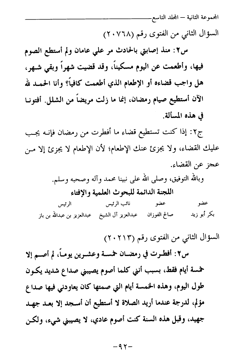 س2: منذ إصابتي بالحادث مر علي عامان ولم أستطع الصوم فيها، وأطعمت عن اليوم مسكينا، وقد قضيت شهرا وبقي شهر، هل واجب قضاؤه أو الإطعام الذي أطعمت كافيا؟ وأنا الحمد لله الآن أستطيع صيام رمضان، إنما ما زلت مريضا من الشلل. أفتونا في هذه المسألة.