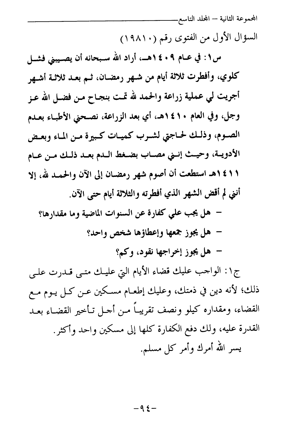 س1: في عام 1409هـ، أراد الله سبحانه أن يصيبني فشل كلوي، وأفطرت ثلاثة أيام من شهر رمضان، ثم بعد ثلاثة أشهر أجريت لي عملية زراعة، والحمد لله تمت بنجاح من فضل الله عز وجل، وفي العام 1410هـ، أي بعد الزراعة، نصحني الأطباء بعدم الصوم، وذلك لحاجتي لشرب كميات كبيرة من الماء وبعض الأدوية، وحيث إنني مصاب بضغط الدم بعد ذلك من عام 1411هـ، استطعت أن أصوم شهر رمضان إلى الآن والحمد لله، إلا أنني لم أقض الشهر الذي أفطرته والثلاثة أيام حتى الآن.