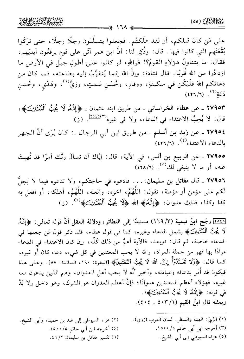 [٢٥٤٥] رجّح ابنُ تيمية (٣/ ١٦٩) مستندًا إلى النظائر، ودلالة العقل أنّ قوله تعالى: {إنه لا يحب المعتدين} يشمل الدعاء وغيره، كما في قول عطاء، فقد ذكر قولَ مَن جعلها في الدعاء خاصة، ثم قال: «وبعد، فالآية أعمُّ من ذلك كُلِّه، وإن كان الاعتداء في الدعاء مرادًا بها فهو من جملة المراد، والله لا يحب المعتدين في كل شيء، دعاء كان أو غيره، كما قال: {ولا تعتدوا إن الله لا يحب المعتدين} [البقرة: ١٩٠، المائدة: ٨٧]. وعلى هذا فيكون قد أمَر بدعائه وعبادته، وأخبر أنّه لا يحب أهل العدوان، وهم الذين يدعون معه غيره، فهؤلاء أعظم المعتدين عدوانًا؛ فإنّ أعظم العدوان هو الشرك، وهو داخل ولا بُدَّ في قوله: {إنه لا يحب المعتدين}».