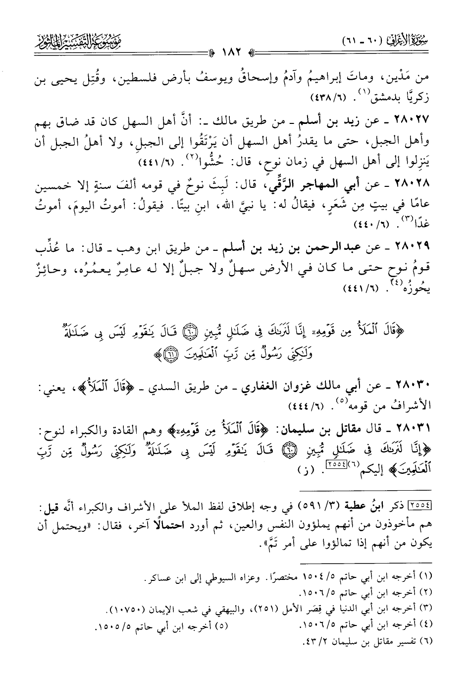 ٢٨٠٢٧ - عن زيد بن أسلم -من طريق مالك-: أنّ أهل السهل كان قد ضاق بهم وأهل الجبل، حتى ما يقدرُ أهل السهل أن يَرْتَقُوا إلى الجبلِ، ولا أهلُ الجبل أن يَنزِلوا إلى أهل السهل في زمان نوحٍ، قال: حُشُّوا (¬٢). (٦/ ٤٤١)