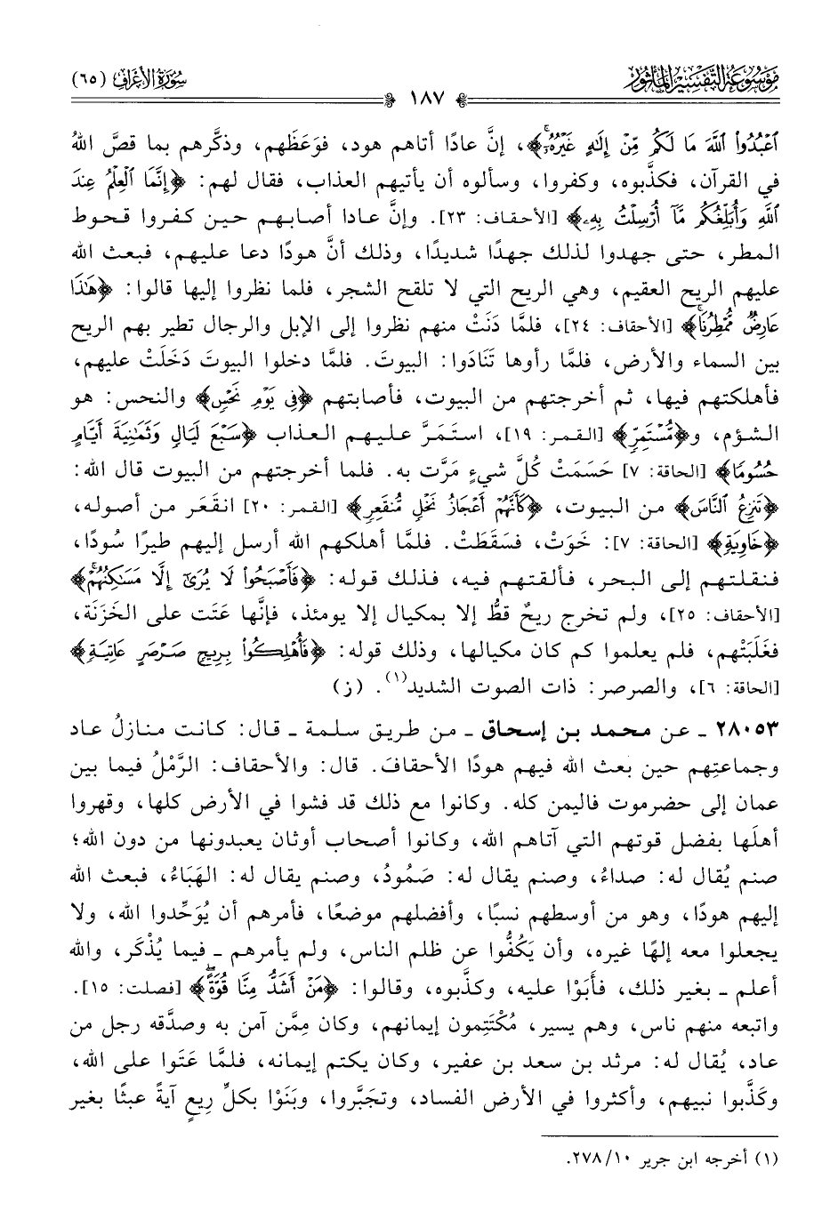 ٢٨٠٥٣ - عن محمد بن إسحاق -من طريق سلمة- قال: كانت منازلُ عاد وجماعتِهم حين بعث الله فيهم هودًا الأحقافَ. قال: والأحقاف: الرَّمْلُ فيما بين عمان إلى حضرموت فاليمن كله. وكانوا مع ذلك قد فشوا في الأرض كلها، وقهروا أهلَها بفضل قوتهم التي آتاهم الله، وكانوا أصحاب أوثان يعبدونها من دون الله؛ صنم يُقال له: صداءُ، وصنم يقال له: صَمُودُ، وصنم يقال له: الهَباءُ، فبعث الله إليهم هودًا، وهو من أوسطهم نسبًا، وأفضلهم موضعًا، فأمرهم أن يُوَحِّدوا الله، ولا يجعلوا معه إلهًا غيره، وأن يَكُفُّوا عن ظلم الناس، ولم يأمرهم -فيما يُذْكَر، والله أعلم- بغير ذلك، فأَبَوْا عليه، وكذَّبوه، وقالوا: {من أشد منا قوة} [فصلت: ١٥]. واتبعه منهم ناس، وهم يسير، مُكْتَتِمون إيمانهم، وكان مِمَّن آمن به وصدَّقه رجل من عاد، يُقال له: مرثد بن سعد بن عفير، وكان يكتم إيمانه، فلمّا عَتَوا على الله، وكَذَّبوا نبيهم، وأكثروا في الأرض الفساد، وتجَبَّروا، وبَنَوْا بكلِّ رِيعٍ آيةً عبثًا بغير