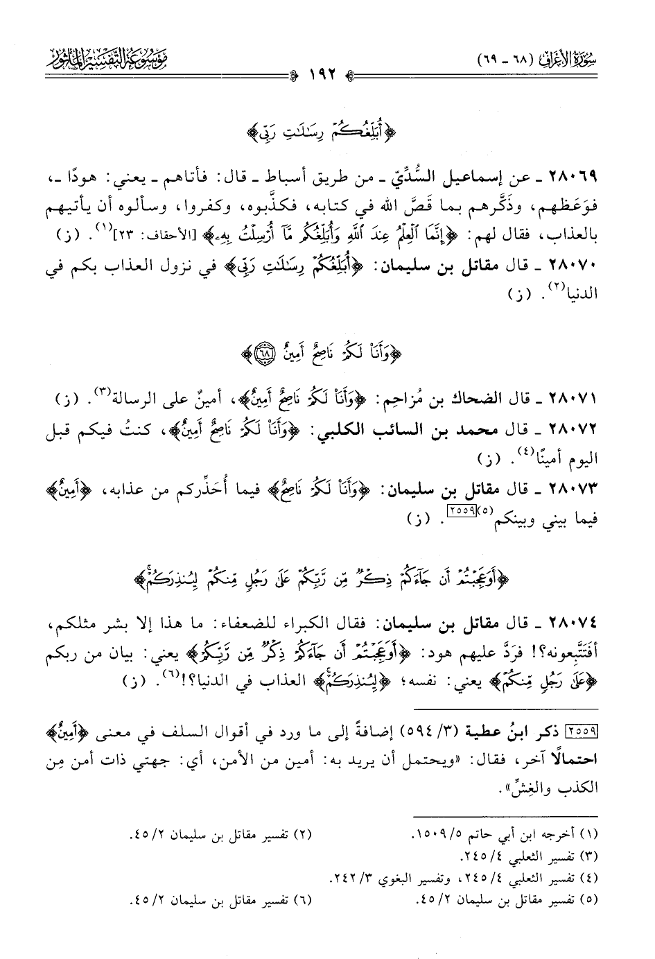 ٢٨٠٧٠ - قال مقاتل بن سليمان: {أبلغكم رسالات ربي} في نزول العذاب بكم في الدنيا (¬٢). (ز)