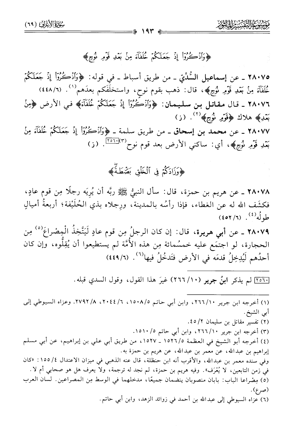 ٢٨٠٧٥ - عن إسماعيل السُّدِّيّ -من طريق أسباط- في قوله: {واذكُرُوا إذ جعلكُم خُلفاء من بعدِ قوم نوحٍ}، قال: ذهب بقوم نوحٍ، واستخلَفَكم بعدَهم (¬١). (٦/ ٤٤٨)