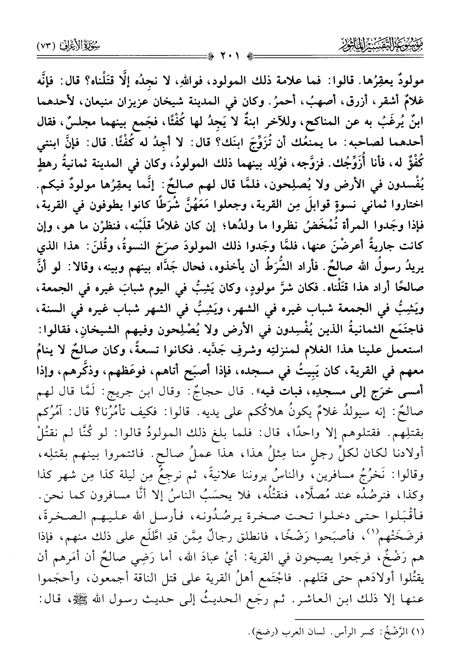 مولودٌ يعقِرُها. قالوا: فما علامة ذلك المولود، فواللهِ، لا نجِدُه إلّا قتَلْناه؟ قال: فإنّه غلامٌ أشقر، أزرق، أصهبُ، أحمرُ. وكان في المدينة شيخان عزيزان منيعان، لأحدهما ابنٌ يُرغَبُ به عن المناكح، وللآخر ابنةٌ لا يَجِدُ لها كُفْئًا، فجَمع بينهما مجلسٌ، فقال أحدهما لصاحبه: ما يمنعُك أن تُزَوِّجَ ابنَك؟ قال: لا أجِدُ له كُفْئًا. قال: فإنّ ابنتي كُفْؤٌ له، فأنا أُزَوِّجُك. فزوَّجه، فوُلِد بينهما ذلك المولودُ، وكان في المدينة ثمانيةُ رهطٍ يُفْسدون في الأرض ولا يُصلِحون، فلمّا قال لهم صالحٌ: إنّما يعقِرُها مولودٌ فيكم. اختاروا ثماني نسوةٍ قوابلَ مِن القرية، وجعلوا مَعَهُنَّ شُرَطًا كانوا يطوفون في القرية، فإذا وجَدوا المرأة تُمْخَضُ نظروا ما ولدُها؛ إن كان غلامًا قلَبْنه، فنظرْن ما هو، وإن كانت جاريةً أعرضْنَ عنها، فلمّا وجَدوا ذلك المولودَ صرَخ النسوةُ، وقُلنَ: هذا الذي يريدُ رسولُ الله صالحٌ. فأراد الشُّرَطُ أن يأخذوه، فحال جَدّاه بينهم وبينه، وقالا: لو أنّ صالحًا أراد هذا قتَلْناه. فكان شرَّ مولودٍ، وكان يَشِبُّ في اليوم شبابَ غيره في الجمعة، ويَشِبُّ في الجمعة شباب غيره في الشهر، ويَشِبُّ في الشهر شباب غيره في السنة، فاجتَمَع الثمانيةُ الذين يُفْسِدون في الأرض ولا يُصْلِحون وفيهم الشيخانِ، فقالوا: استعمل علينا هذا الغلام لمنزلتِه وشرفِ جَدَّيه. فكانوا تسعةً، وكان صالحٌ لا ينامُ معهم في القرية، كان يَبِيتُ في مسجده، فإذا أصبَح أتاهم، فوعَظهم، وذكَّرهم، وإذا أمسى خرَج إلى مسجدِه، فبات فيه». قال حجاجٌ: وقال ابن جريج: لَمّا قال لهم صالحٌ: إنه سيولدُ غلامٌ يكونُ هلاكُكم على يديه. قالوا: فكيف تأمُرُنا؟ قال: آمُرُكم بقتلِهم. فقتلوهم إلا واحدًا، قال: فلما بلغ ذلك المولودُ قالوا: لو كُنّا لم نقتُلْ أولادنا لكان لكلِّ رجلٍ منا مِثلُ هذا، هذا عملُ صالحٍ. فائتمروا بينهم بقتلِه، وقالوا: نَخرُجُ مسافرين، والناسُ يروننا علانيةً، ثم نرجِعُ مِن ليلة كذا مِن شهر كذا وكذا، فنرصُدُه عند مُصلّاه، فنقتُلُه، فلا يحسَبُ الناسُ إلا أنّا مسافرون كما نحن. فأقْبَلوا حتى دخلوا تحت صخرة يرصُدُونه، فأرسل الله عليهم الصخرةَ، فرضَخَتْهم (¬١)، فأصبَحوا رَضْخًا، فانطلق رجالٌ مِمَّن قدِ اطَّلَع على ذلك منهم، فإذا هم رَضْخٌ، فرجَعوا يصيحون في القرية: أيْ عبادَ الله، أما رَضِي صالحٌ أن أمَرهم أن يقتُلوا أولادَهم حتى قتَلهم. فاجْتَمع أهلُ القرية على قتل الناقة أجمعون، وأحجَموا عنها إلا ذلك ابن العاشر. ثم رجَع الحديثُ إلى حديث رسول الله - صلى الله عليه وسلم -، قال: