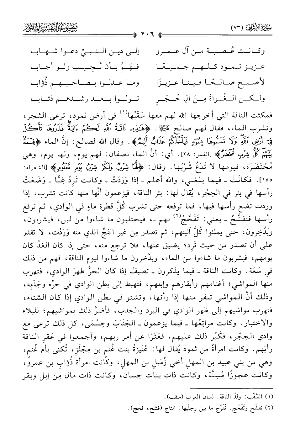 فمكثت الناقة التي أخرجها الله لهم معها سَقْبُها (¬١) في أرض ثمود، ترعى الشجر، وتشرب الماء، فقال لهم صالح - عليه السلام -: {هذه ناقة الله لكم آية فذروها تأكل في أرض الله ولا تمسوها بسوء فيأخذكم عذاب أليم}. وقال الله لصالح: إنّ الماء {قسمة بينهم كل شرب محتضر} [القمر: ٢٨]. أي: أنّ الماء نصفان: لهم يوم، ولها يوم، وهي مُحْتَضَرَة، فيومها لا تَدَعُ شُرْبَها. وقال: {لها شرب ولكم شرب يوم معلوم} [الشعراء: ١٥٥]. فكانَتْ -فيما بلغني، والله أعلم- إذا ورَدَتْ -وكانت تَرِدُ غِبًّا- وضَعَتْ رأسها في بئر في الحِجْر، يُقال لها: بئر الناقة، فيزعمون أنّها منها كانت تشرب، إذا وردت تضع رأسها فيها، فما ترفعه حتى تشرب كُلَّ قطرةِ ماءٍ في الوادي، ثم ترفع رأسها فتفشَّحُ -يعني: تَفَحَّجُ (¬٢) لهم-، فيحتلبون ما شاءوا من لبن، فيشربون، ويَدَّخِرون، حتى يملئوا كُلَّ آنيتهم، ثم تصدر مِن غير الفجِّ الذي منه ورَدْت، لا تقدر على أن تصدر من حيث تَرِد؛ يضيق عنها، فلا ترجع منه، حتى إذا كان الغدُ كان يومهم، فيشربون ما شاءوا من الماء، ويدَّخرون ما شاءوا ليوم الناقة، فهم من ذلك في سَعَة. وكانت الناقة -فيما يذكرون- تصيفُ إذا كان الحرُّ ظهرَ الوادي، فتهرب منها المواشي؛ أغنامهم وأبقارهم وإبلهم، فتهبط إلى بطن الوادي في حرِّه وجَدْبِه، وذلك أنّ المواشي تنفر منها إذا رأتها، وتشتو في بطن الوادي إذا كان الشتاء، فتهرب مواشيهم إلى ظهر الوادي في البرد والجدب، فأضرَّ ذلك بمواشيهم؛ للبلاء والاختبار. وكانت مراتِعُها -فيما يزعمون- الجَنابَ وحِسْمى، كل ذلك ترعى مع وادي الحِجْر، فكَبُر ذلك عليهم، فعَتَوْا عن أمر ربهم، وأجمعوا في عَقْرِ الناقة رأيَهم. وكانت امرأةٌ من ثمود يُقال لها: عُنَيزةُ بنت غُنمٍ بن مِجْلَزِ، تُكنى بأم غُنمٍ، وهي من بني عبيد بن المهلِ أخي زُمَيلِ بن المهلِ، وكانت امرأة ذُؤابِ بن عمرو، وكانت عجوزًا مُسِنَّة، وكانت ذات بنات حِسان، وكانت ذات مال مِن إبل وبقر