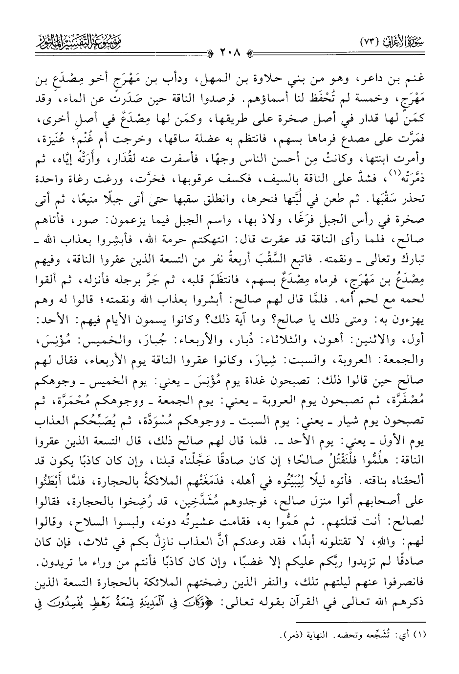 غنم بن داعر، وهو من بني حلاوة بن المهل، ودأب بن مَهْرَجٍ أخو مِصْدَعِ بن مَهْرَجٍ، وخمسة لم تُحْفَظ لنا أسماؤهم. فرصدوا الناقة حين صَدَرت عن الماء، وقد كمَن لها قدار في أصل صخرة على طريقها، وكمَن لها مِصْدَعٌ في أصلِ أخرى، فمَرَّت على مصدع فرماها بسهم، فانتظم به عضلة ساقها، وخرجت أم غُنْمٍ؛ عُنَيزة، وأمرت ابنتها، وكانتْ مِن أحسن الناس وجهًا، فأسفرت عنه لقُدار، وأَرَتْه إيّاه، ثم ذمَّرَتْه (¬١)، فشدَّ على الناقة بالسيف، فكسف عرقوبها، فخرَّت، ورغت رغاة واحدة تحذر سَقْبَها. ثم طعن في لُبَّتها فنحرها، وانطلق سقبها حتى أتى جبلًا منيعًا، ثم أتى صخرة في رأس الجبل فرَغا، ولاذ بها، واسم الجبل فيما يزعمون: صور، فأتاهم صالح، فلما رأى الناقة قد عقرت قال: انتهكتم حرمة الله، فأبشِروا بعذاب الله -تبارك وتعالى- ونقمته. فاتبع السَّقْبَ أربعةُ نفر من التسعة الذين عقروا الناقة، وفيهم مِصْدَعُ بن مَهْرَجٍ، فرماه مِصْدَعٌ بسهم، فانتظَمَ قلبه، ثم جَرَّ برجله فأنزله، ثم ألقوا لحمه مع لحم أمه. فلمّا قال لهم صالح: أبشروا بعذاب الله ونقمته؛ قالوا له وهم يهزءون به: ومتى ذلك يا صالح؟ وما آية ذلك؟ وكانوا يسمون الأيام فيهم: الأحد: أول، والاثنين: أهون، والثلاثاء: دُبار، والأربعاء: جُبارَ، والخميس: مُؤْنِسَ، والجمعة: العروبة، والسبت: شِيارَ، وكانوا عقروا الناقة يوم الأربعاء، فقال لهم صالح حين قالوا ذلك: تصبحون غداة يوم مُؤْنِسَ -يعني: يوم الخميس- وجوهكم مُصْفَرَّة، ثم تصبحون يوم العروبة -يعني: يوم الجمعة- ووجوهكم مُحْمَرَّة، ثم تصبحون يوم شيار -يعني: يوم السبت- ووجوهكم مُسْوَدَّة، ثم يُصَبِّحُكم العذاب يوم الأول -يعني: يوم الأحد-. فلما قال لهم صالح ذلك، قال التسعة الذين عقروا الناقة: هلُمُّوا فلْنَقْتُلْ صالحًا؛ إن كان صادقًا عَجَّلْناه قبلنا، وإن كان كاذبًا يكون قد ألحقناه بناقته. فأتوه ليلًا لِيُبَيِّتُوه في أهله، فدَمَغَتْهم الملائكةُ بالحجارة، فلمّا أبْطَئُوا على أصحابهم أتوا منزل صالح، فوجدوهم مُشَدَّخِين، قد رُضِخوا بالحجارة، فقالوا لصالح: أنت قتلتهم. ثم هَمُّوا به، فقامت عشيرتُه دونه، ولبسوا السلاح، وقالوا لهم: واللهِ، لا تقتلونه أبدًا، فقد وعدكم أنّ العذاب نازِلٌ بكم في ثلاث، فإن كان صادقًا لم تزيدوا ربَّكم عليكم إلا غضبًا، وإن كان كاذبًا فأنتم من وراء ما تريدون. فانصرفوا عنهم ليلتهم تلك، والنفر الذين رضختهم الملائكة بالحجارة التسعة الذين ذكرهم الله تعالى في القرآن بقوله تعالى: {وكان في المدينة تسعة رهط يفسدون في