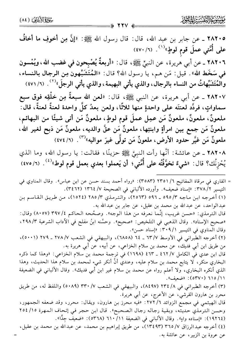 ٢٨٢٠٦ - عن أبي هريرة، عن النبيِّ - صلى الله عليه وسلم -، قال: «أربعةٌ يُصْبِحون في غضب الله، ويُمْسون في سَخَط الله». قيل: مَن هم، يا رسول الله؟ قال: «المُتَشَبِّهون مِن الرجال بالنساء، والمُتَشَبِّهاتُ من النساء بالرجال، والذي يأتي البهيمة، والذي يأتي الرجلَ» (¬٢). (٦/ ٤٧١)