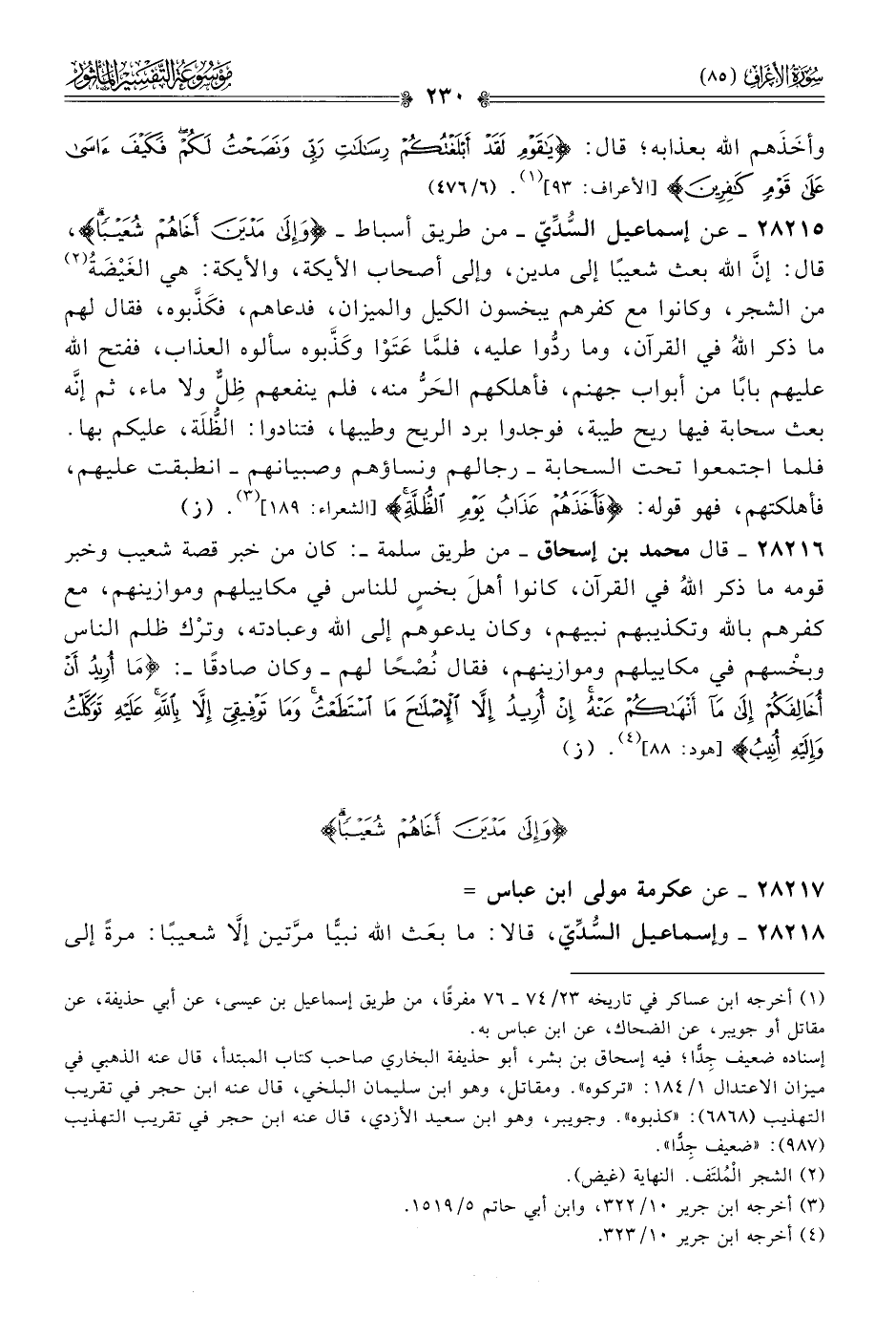 ٢٨٢١٥ - عن إسماعيل السُّدِّيّ -من طريق أسباط- {وإلى مدين أخاهم شعيبا}، قال: إنّ الله بعث شعيبًا إلى مدين، وإلى أصحاب الأيكة، والأيكة: هي الغَيْضَةُ (¬٢) من الشجر، وكانوا مع كفرهم يبخسون الكيل والميزان، فدعاهم، فكَذَّبوه، فقال لهم ما ذكر اللهُ في القرآن، وما ردُّوا عليه، فلمّا عَتَوْا وكَذَّبوه سألوه العذاب، ففتح الله عليهم بابًا من أبواب جهنم، فأهلكهم الحَرُّ منه، فلم ينفعهم ظِلٌّ ولا ماء، ثم إنّه بعث سحابة فيها ريح طيبة، فوجدوا برد الريح وطيبها، فتنادوا: الظُّلَة، عليكم بها. فلما اجتمعوا تحت السحابة -رجالهم ونساؤهم وصبيانهم- انطبقت عليهم، فأهلكتهم، فهو قوله: {فأخذهم عذاب يوم الظلة} [الشعراء: ١٨٩] (¬٣). (ز)