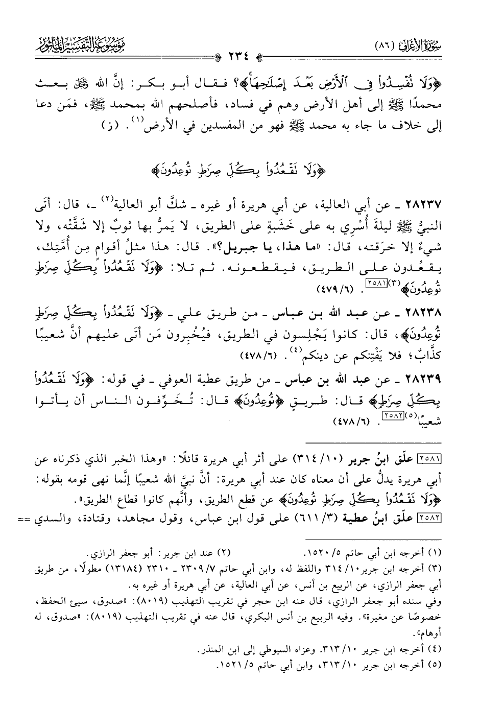 [٢٥٨١] علّق ابنُ جرير (١٠/ ٣١٤) على أثر أبي هريرة قائلًا: «وهذا الخبر الذي ذكرناه عن أبي هريرة يدلُّ على أن معناه كان عند أبي هريرة: أنّ نبيَّ الله شعيبًا إنّما نهى قومه بقوله: {ولا تقعدوا بكل صراط توعدون} عن قطع الطريق، وأنّهم كانوا قطاع الطريق».