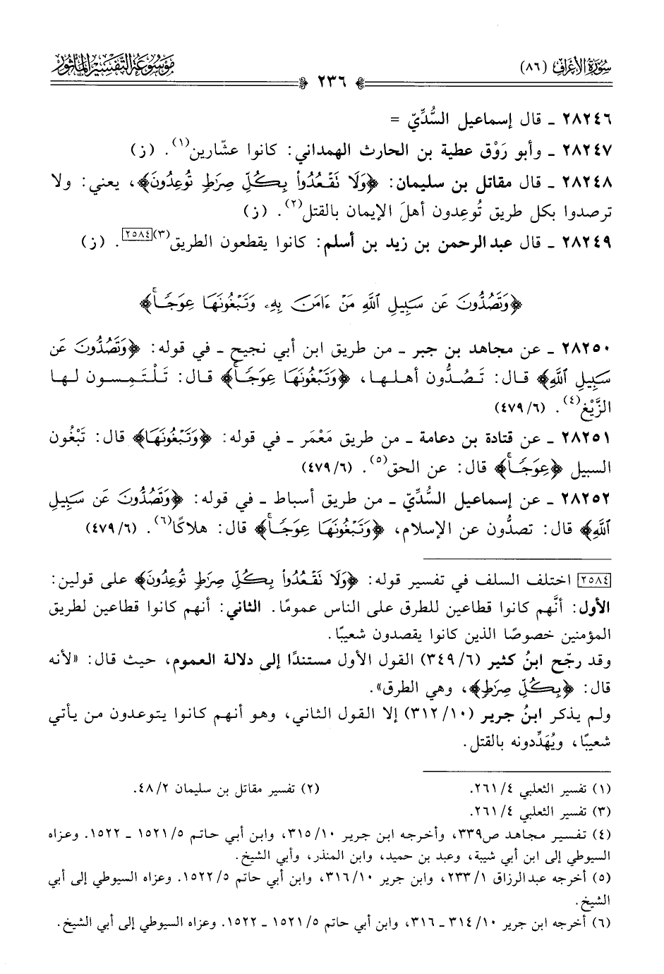 [٢٥٨٤] اختلف السلف في تفسير قوله: {ولا تقعدوا بكل صراط توعدون ... } على قولين: الأول: أنّهم كانوا قطاعين للطرق على الناس عمومًا. الثاني: أنهم كانوا قطاعين لطريق المؤمنين خصوصًا الذين كانوا يقصدون شعيبًا.