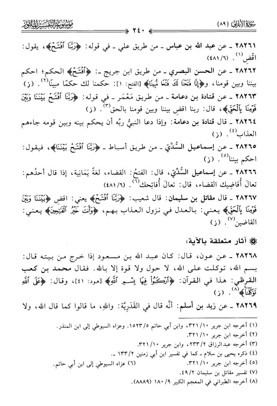 ٢٨٢٦٥ - عن إسماعيل السُّدِّيّ -من طريق أسباط- {رَبَّنا افْتَحْ بَيْنَنا}، فيقول: احكم بيننا (¬٥). (ز)