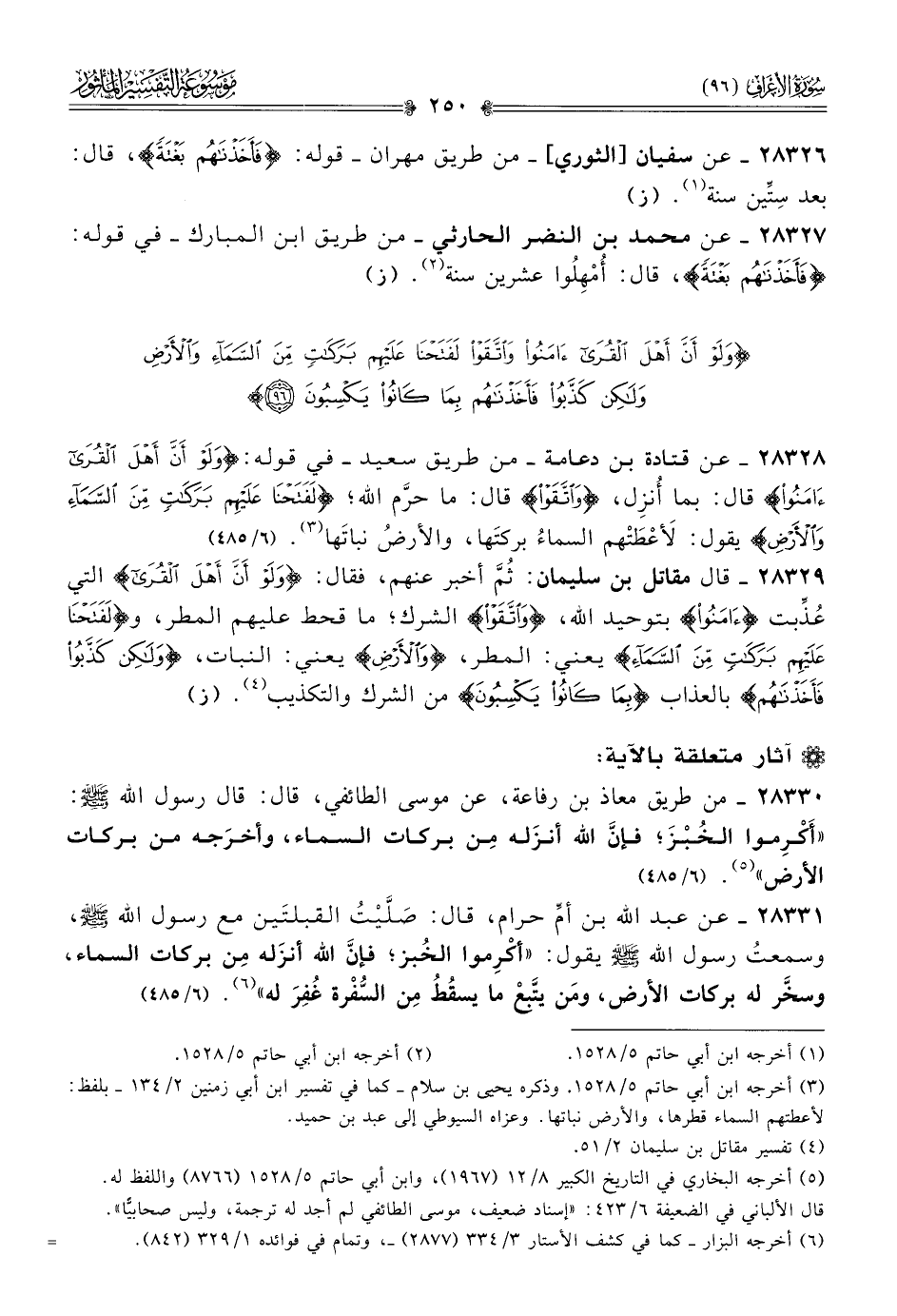 (¬٣) أخرجه ابن أبي حاتم ٥/ ١٥٢٨. وذكره يحيى بن سلام -كما في تفسير ابن أبي زمنين ٢/ ١٣٤ - بلفظ: لأعطتهم السماء قطرها، والأرض نباتها. وعزاه السيوطي إلى عبد بن حميد.