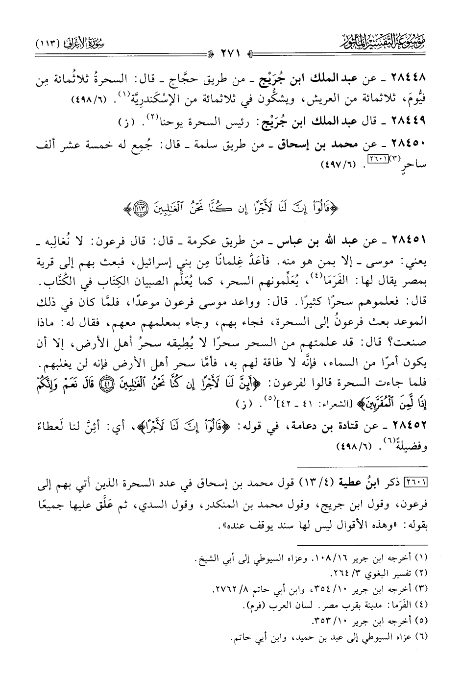 ٢٨٤٤٨ - عن عبد الملك ابن جُرَيْج -من طريق حجّاج- قال: السحرةُ ثلاثُمائة مِن فيُّومَ، ثلاثمائة من العريش، ويشكُّون في ثلاثمائة من الإسْكَندرِيَّة (¬١). (٦/ ٤٩٨)