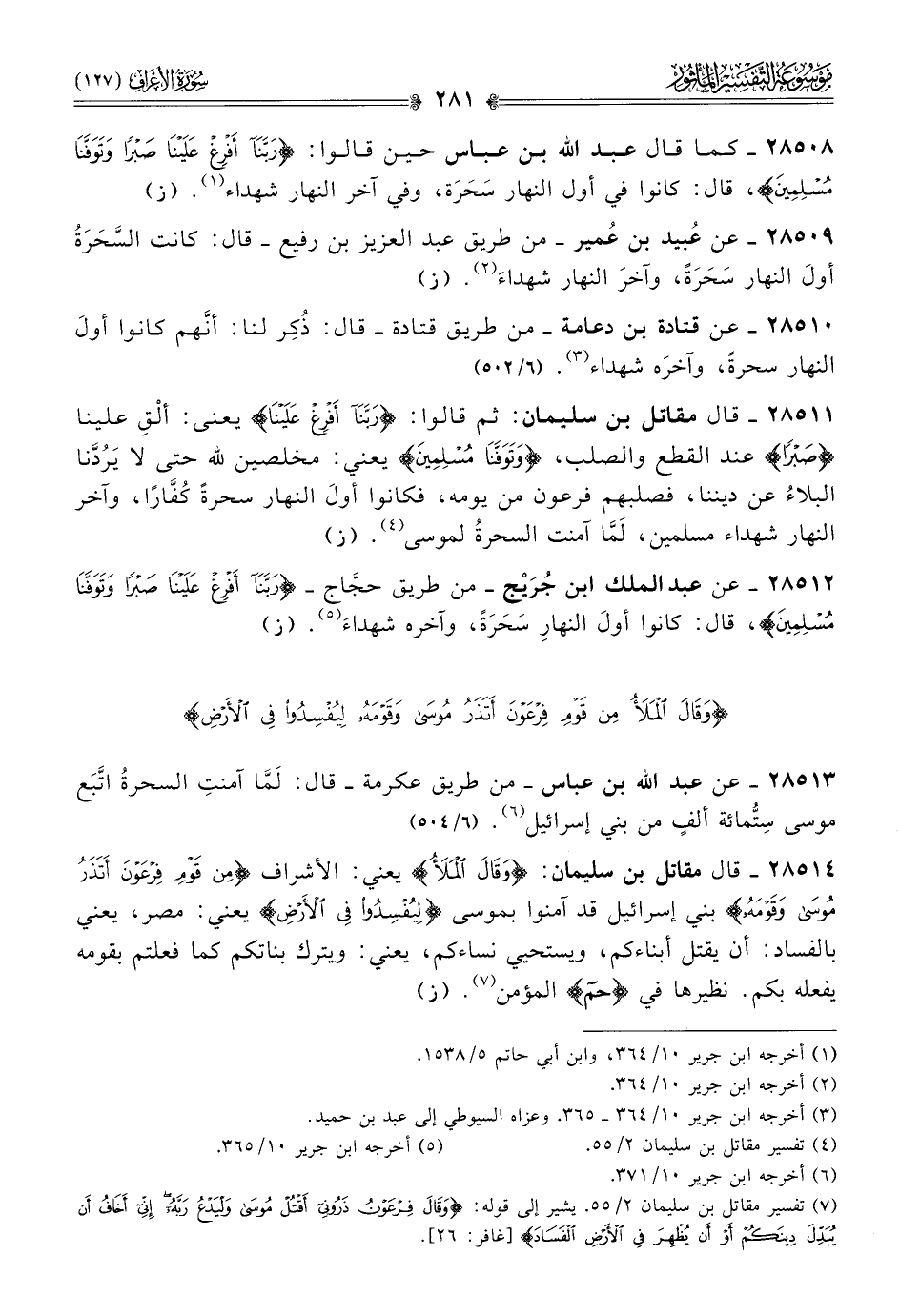 ٢٨٥١٢ - عن عبد الملك ابن جُرَيْج -من طريق حجّاج- {ربنا أفرغ علينا صبرا وتوفنا مسلمين}، قال: كانوا أولَ النهارِ سَحَرَةً، وآخره شهداءَ (¬٥).
